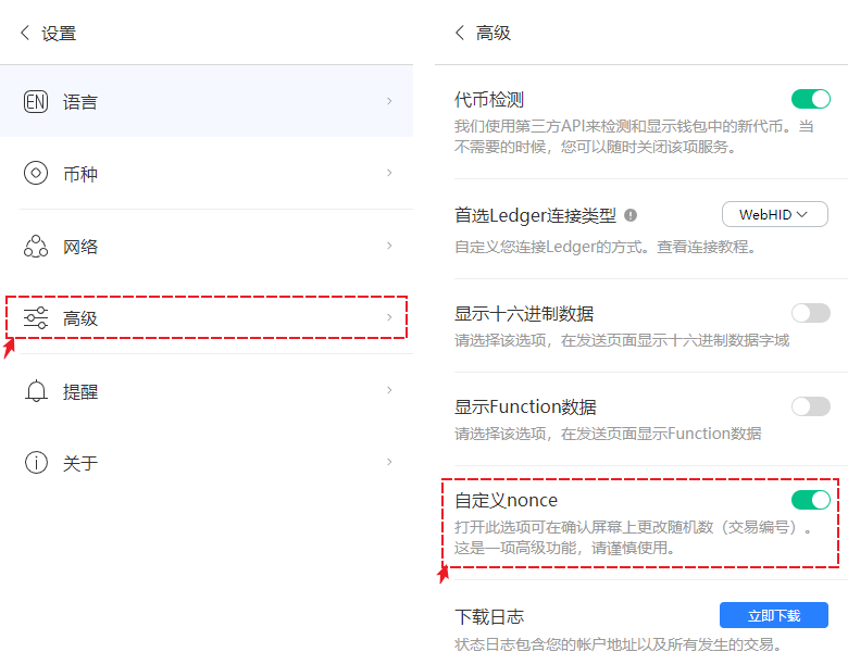 在设置界面中点击【高级】选择自定义nonce，打开开关，就可以完成功能的启用。