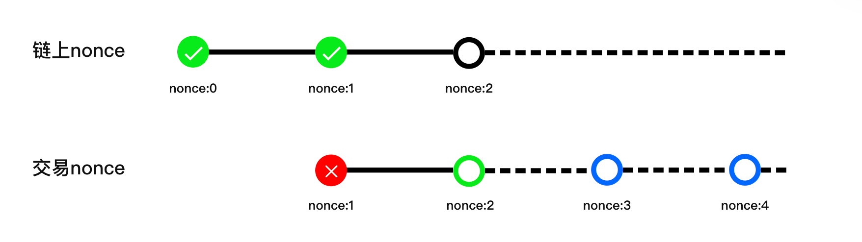 以上图为例，链上需要一个nonce为2的交易，如果这个时候发出nonce为1的交易则立刻失败，同样，如果发出nonce为3或者4的交易，也立即失败。必须发出nonce为2的交易，才可以成功。 只要交易不发送到链上，交易就可以出现在交易队列里，等待后续执行。