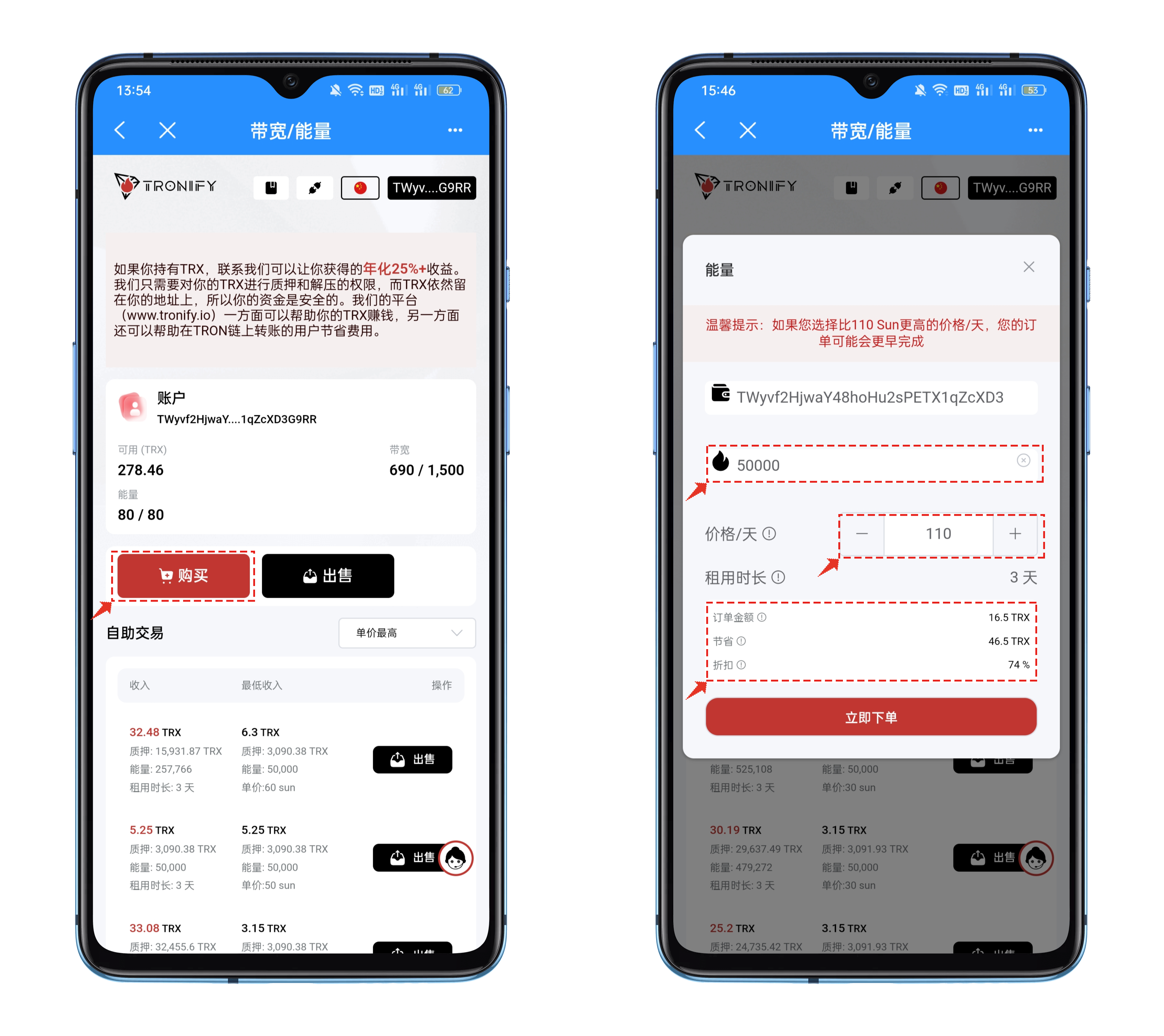 **购买能量：**&#x70B9;击【购买】菜单，在界面中按照设置购买数量，系统要求的50,000-1,000,000,000 数量范围来进行租借；价格/天，这里代表的是能量单价（如果选择高于110Sun的价格，订单可能会提前完成。）租用时长默认为3天。确认好信息后就可以点击【立即下单】。