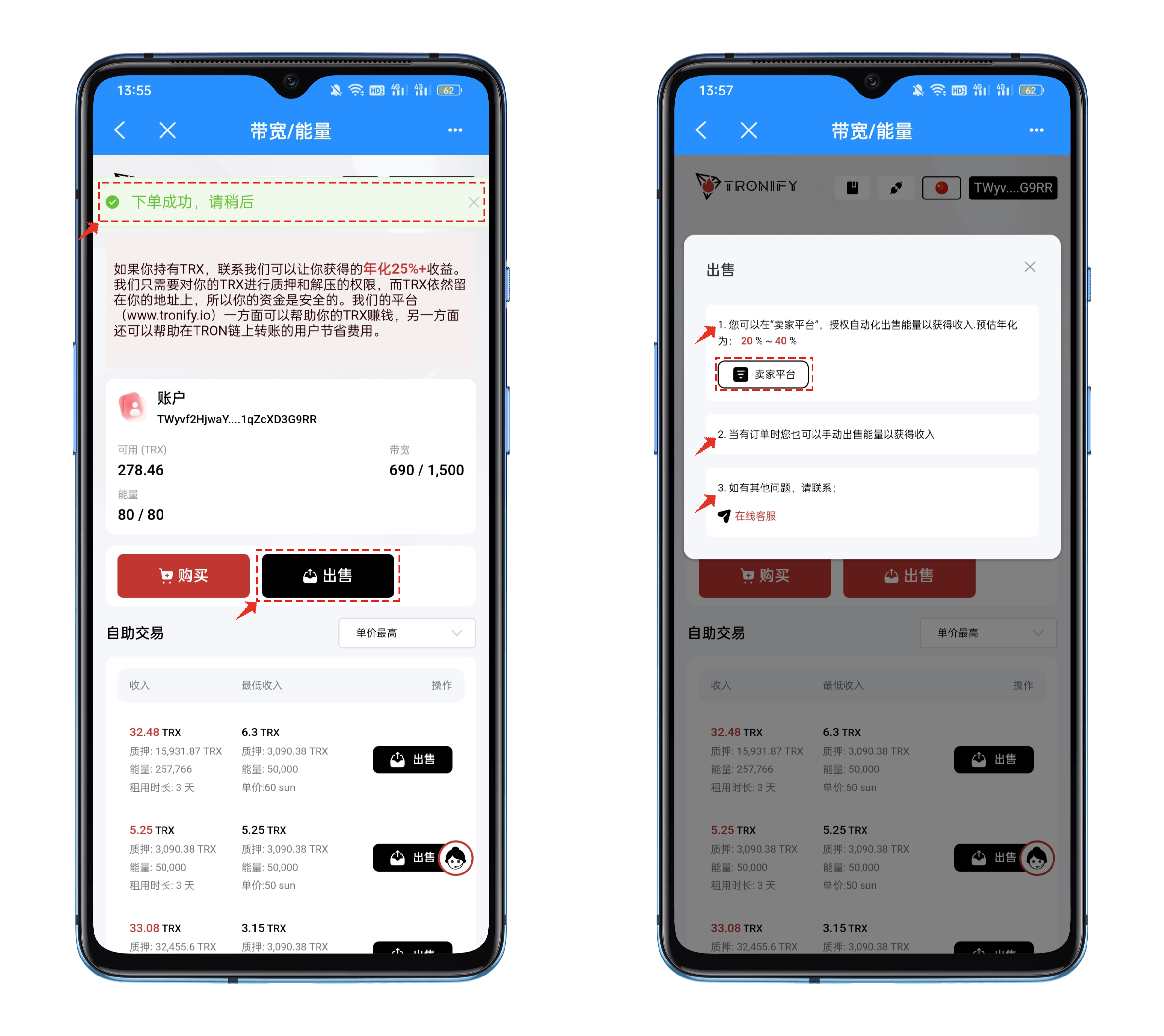2、完成购买后，可以在界面顶部看到绿色的提示信息，需要等待一小会儿就会看到能量的增加。点击【出售】菜单，在弹出的界面中可以看到三个选项，其中第一和第二选项是选择确认出售能量的方式，这里重点说一下第一种方法，可以通过图中查看具体的操作方法，是利用了波场可以设置多签名的原理，给这个DApp的地址一个Active的授权，但仅限于以下六种权限的设置，按照下面的选择配置权限即可。