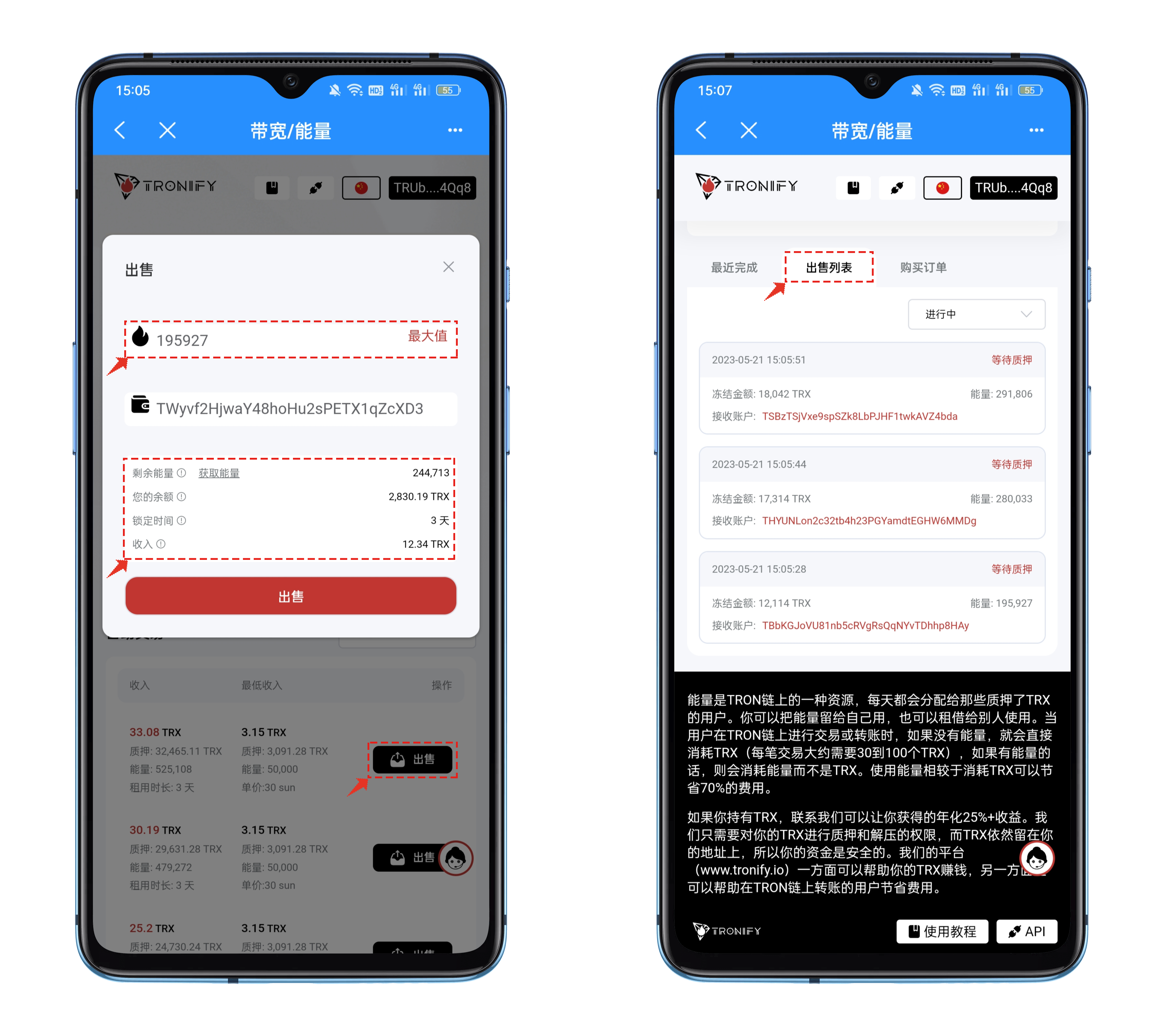 -投票：授权投票权限，可在出售成功后自动投票，获取TRX权益奖励；