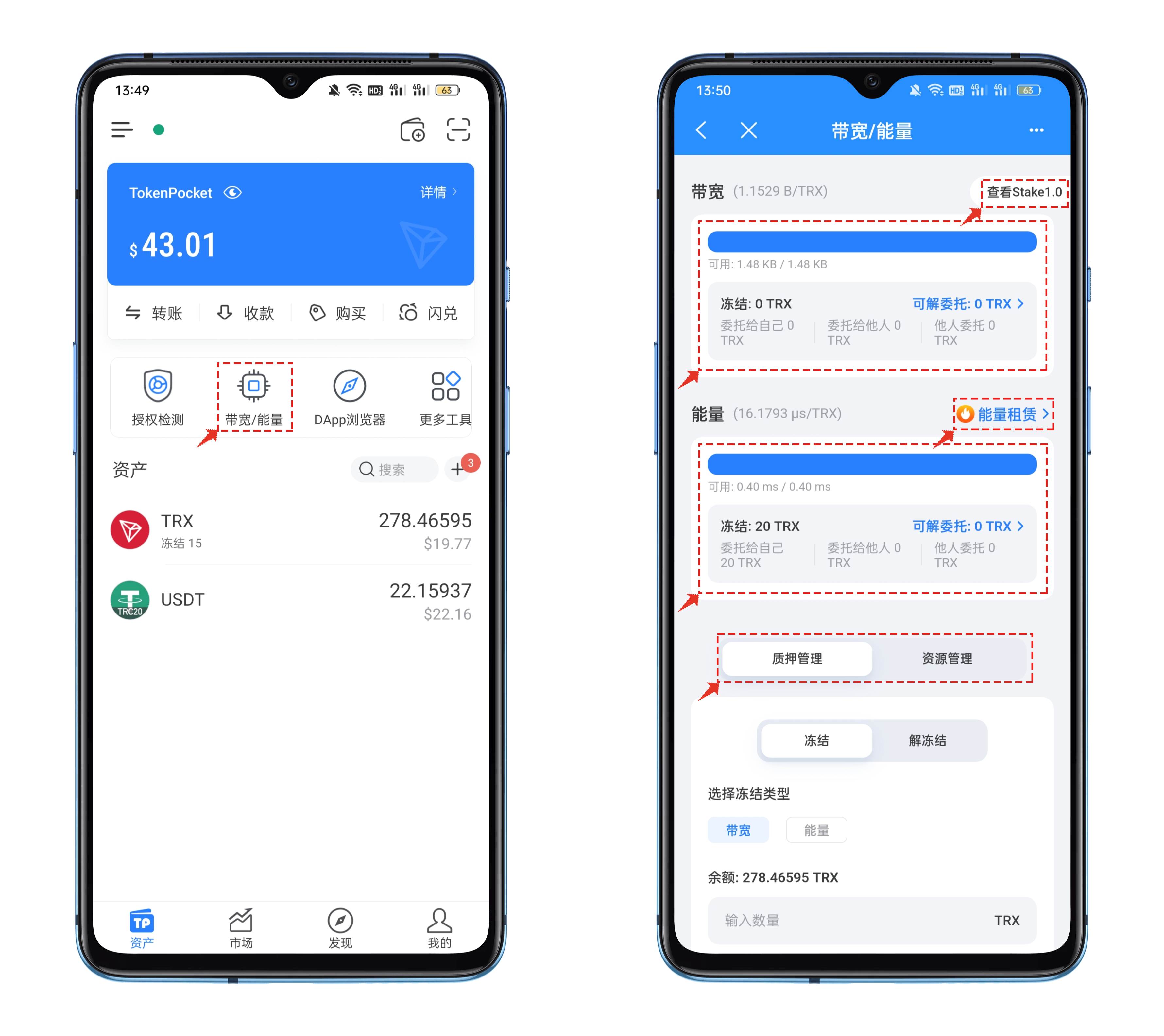 1、打开TokenPocket，点击工具栏中的【带宽/能量】菜单，在带宽/能量界面中包含多种功能。