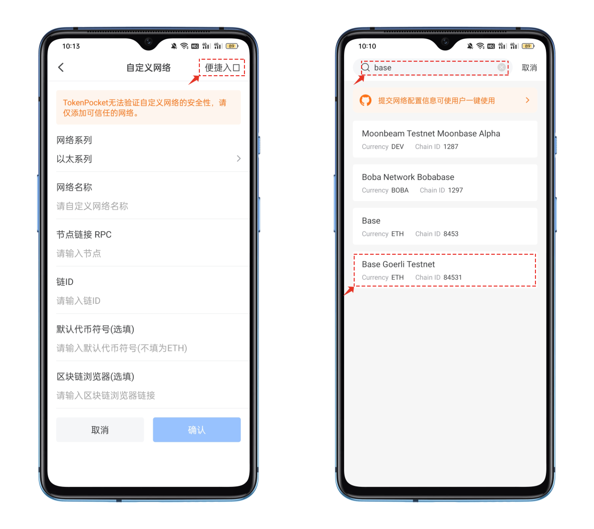 2、在自定义网络编辑界面中，点击右上角的【便捷入口】，在打开界面顶部填入关键词base，选择正确的公链。