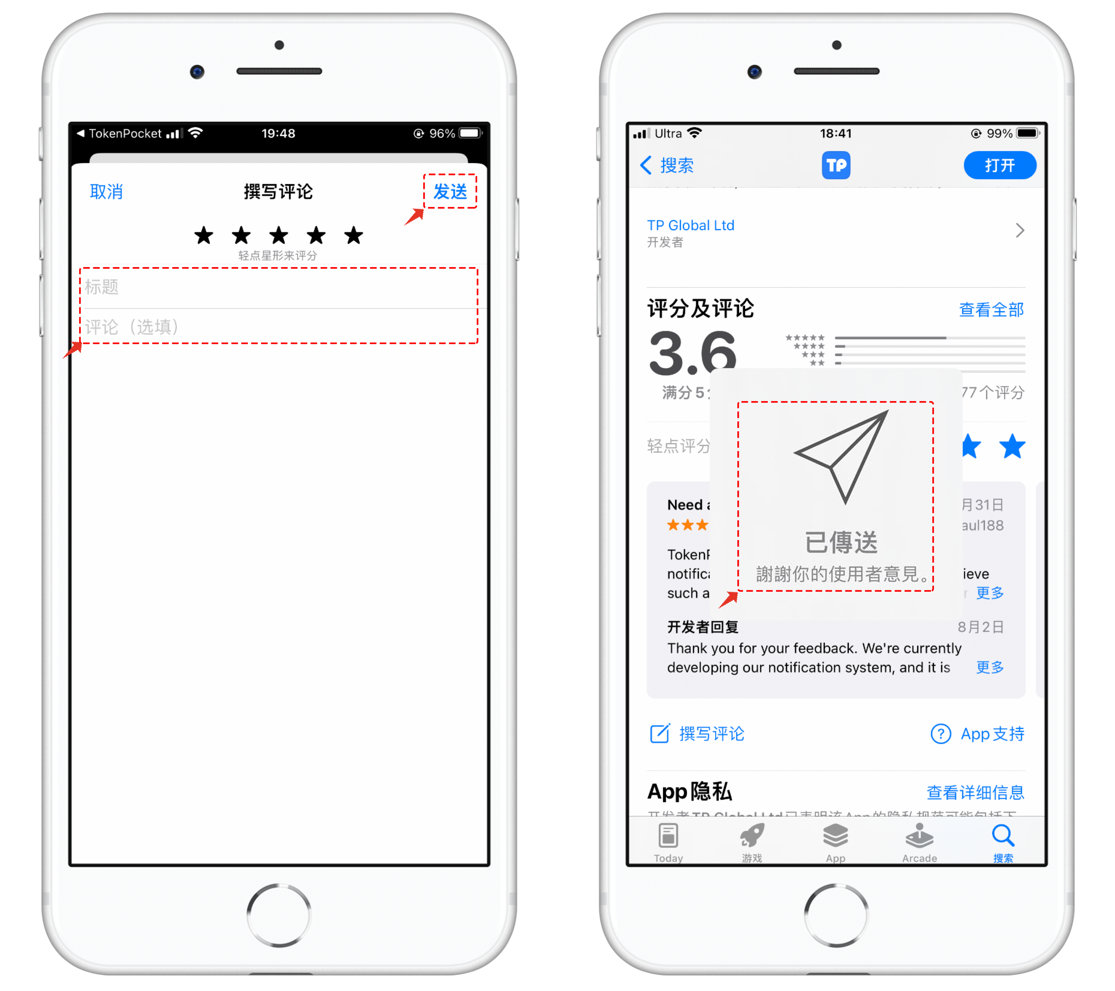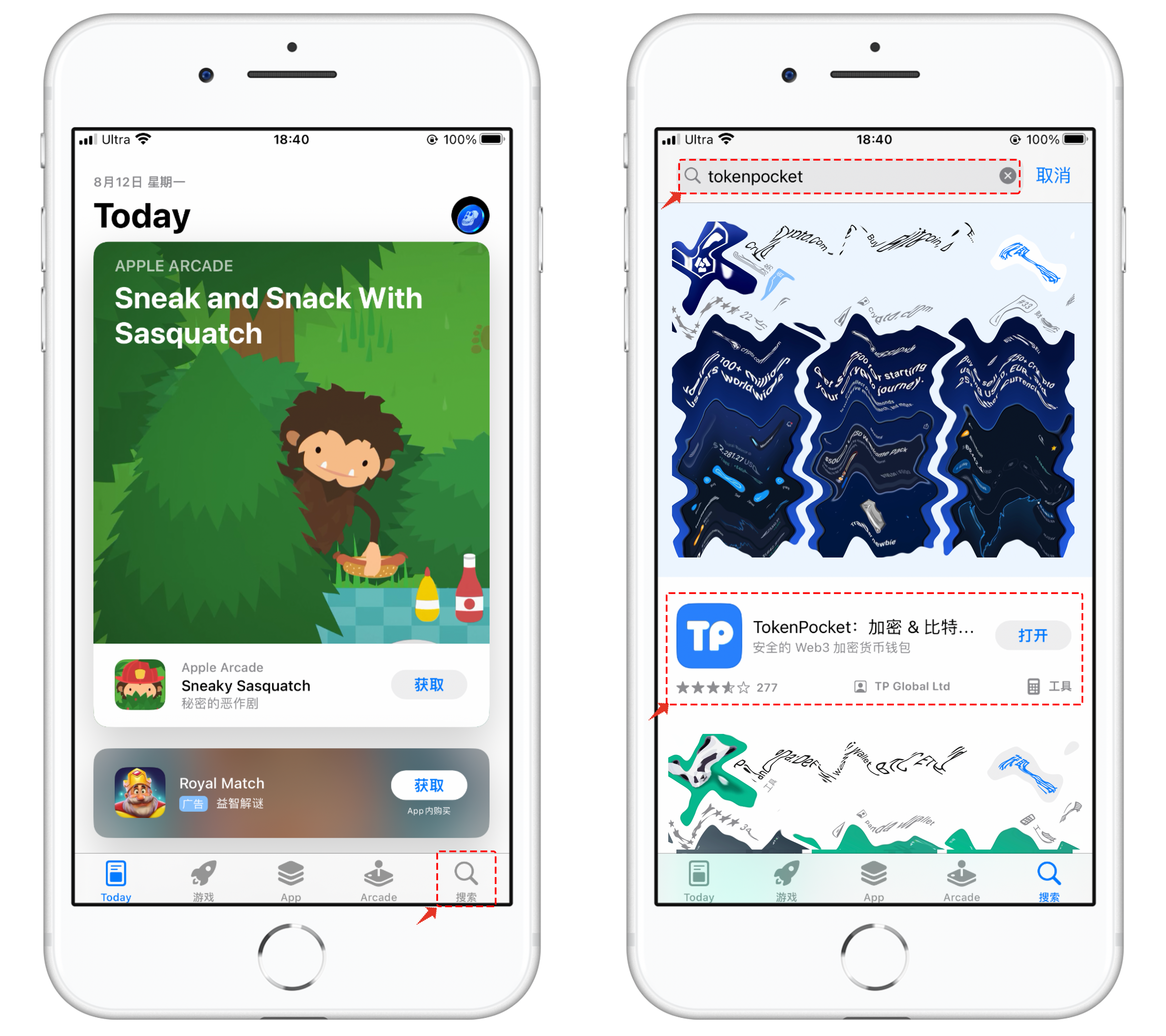 1、打开App Store，点击右下角的【搜索】功能，填入搜索关键词【TokenPocket】并查询结果，在搜索结果中选择蓝色图标的TokenPocket，界面提示下方可以看到开发者为【TP Global Ltd】，请务必认准开发者，这是唯一的TokenPocket官方标识。