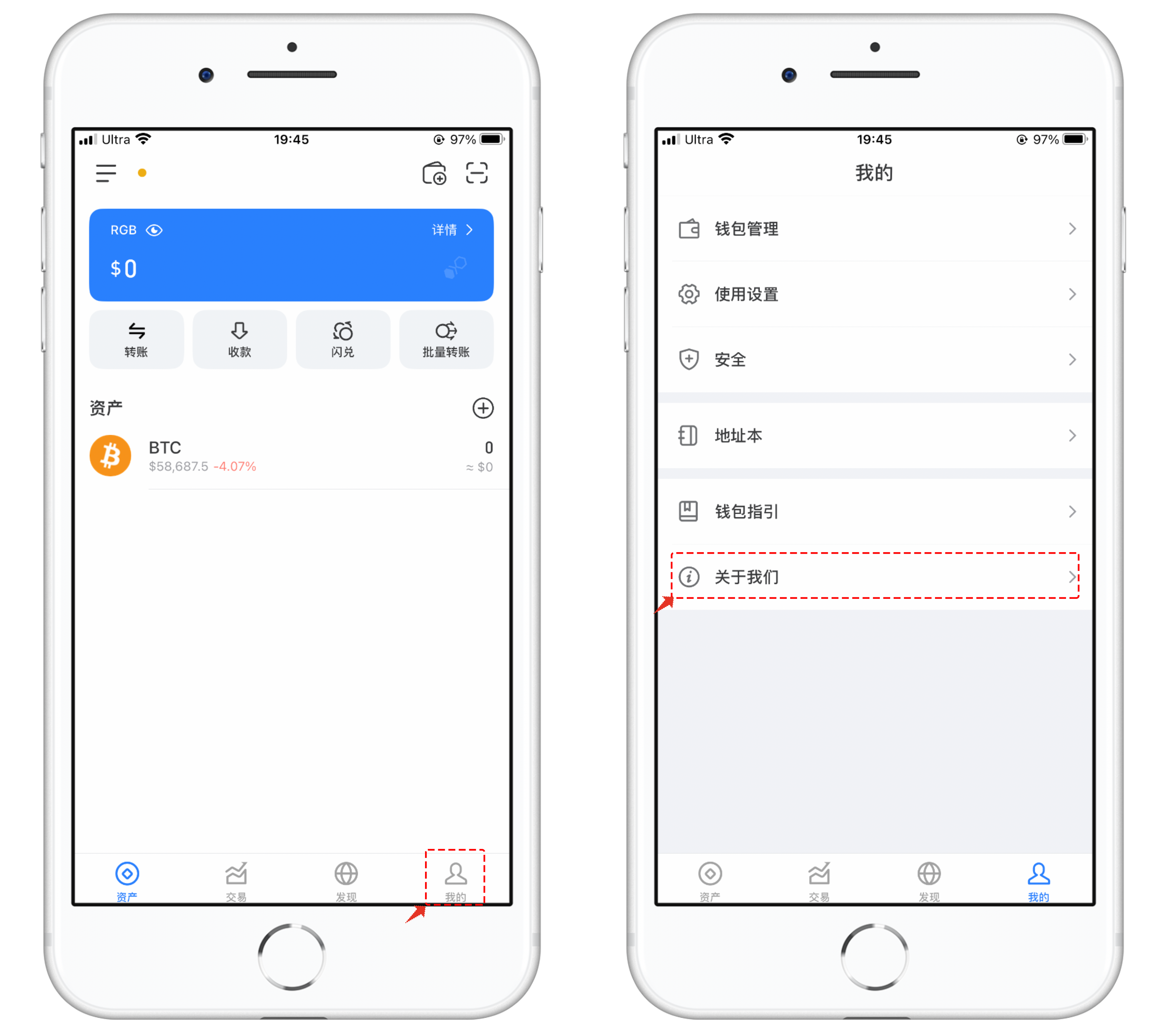 1、打开TokenPocket，点击\[我的]，\[关于我们]。