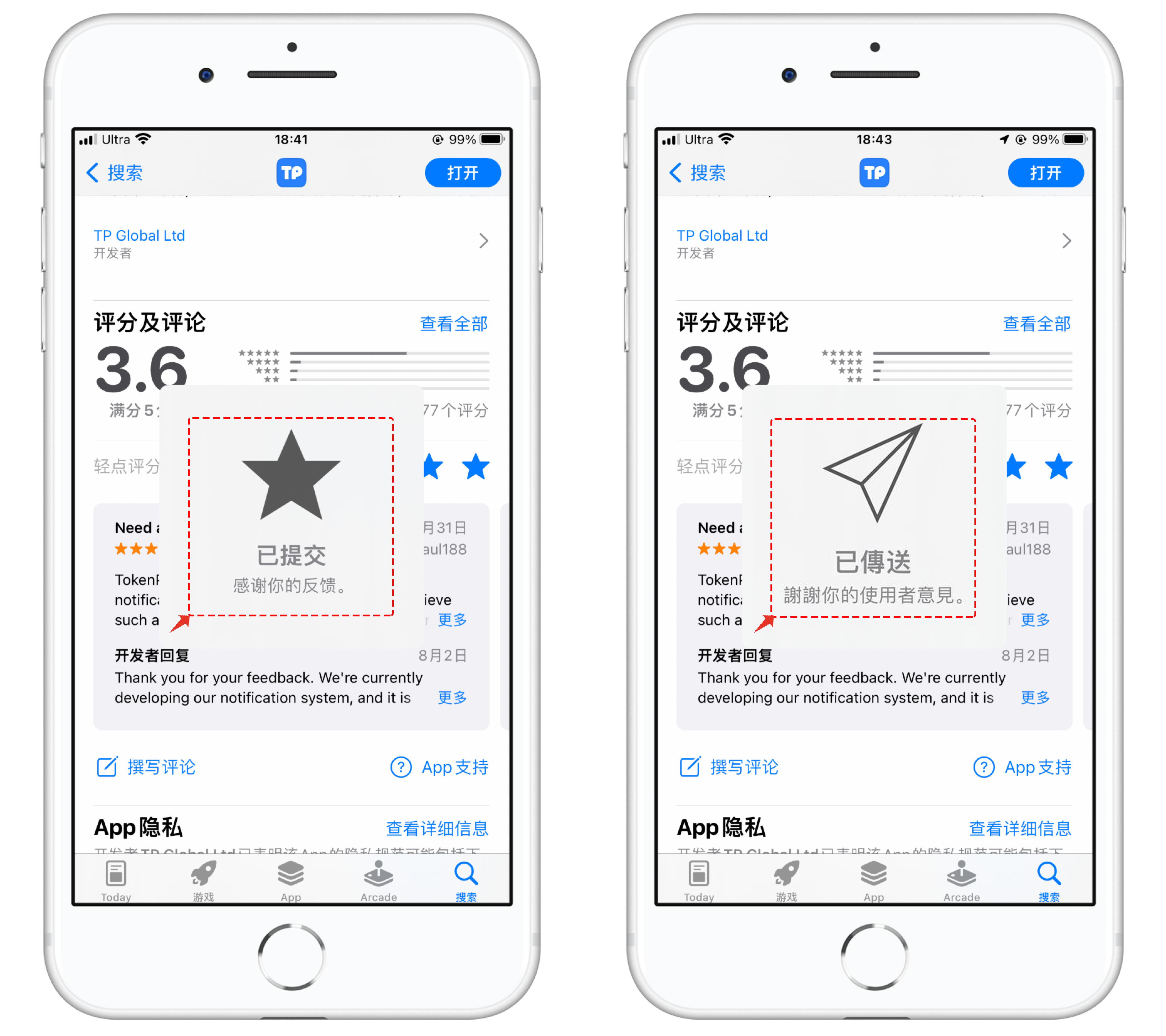 2、点击TokenPocket进入到详情界面，在详情界面中也可以看到醒目的开发者【TP Global Ltd】，界面下拉就可以看到评分和评论（问题反馈）的界面。