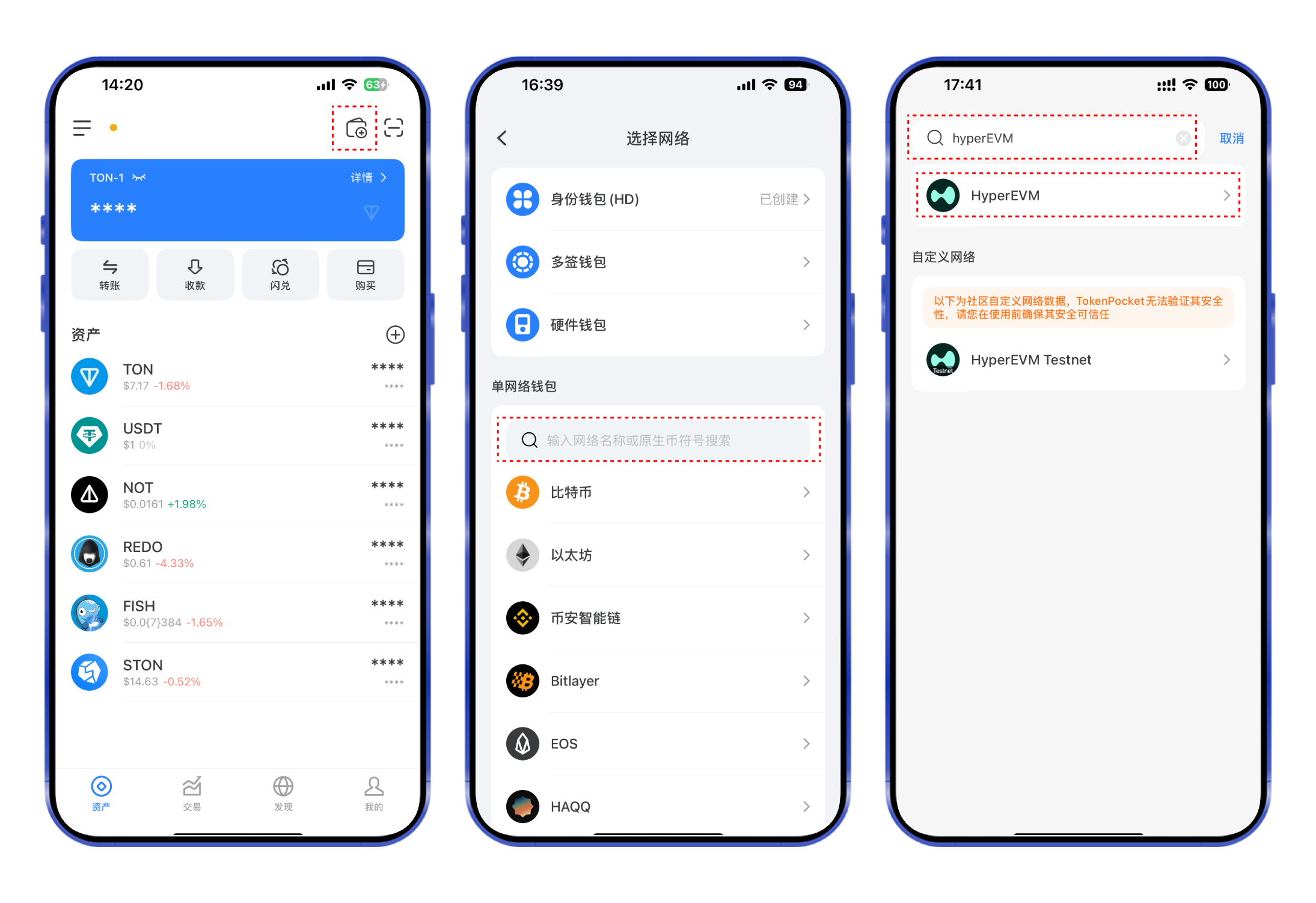 1、打开TokenPocket APP，点击右上角![](https://help.tokenpocket.pro/~gitbook/image?url=https%3A%2F%2F261497644-files.gitbook.io%2F%7E%2Ffiles%2Fv0%2Fb%2Fgitbook-x-prod.appspot.com%2Fo%2Fspaces%252F-MMF2k4MCaxErpZyah2d%252Fuploads%252FioAtG3c3vksPagygLtd1%252Fimage.png%3Falt%3Dmedia%26token%3Db5023fb5-a27c-49a5-b40a-ac84a26eb00f\&width=300\&dpr=4\&quality=100\&sign=7d6af2c1\&sv=1)，点击搜索栏，然后输入**HyperEVM;**
