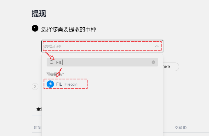 进入到【提现】界面，在币种搜索栏中点击并填入FIL，选择FIL代币。