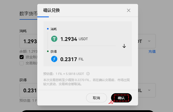 确认兑换界面可以查看到兑换的方向和预估值等信息，点击【确认】。