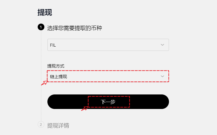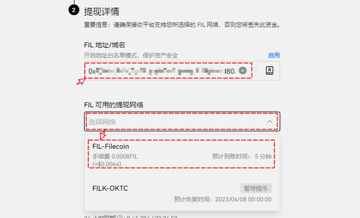 在提现详情界面，填入需要收款的0x开头的地址，在提现网络中选择FIL网络，这里没有单独列出FEVM网络选项。