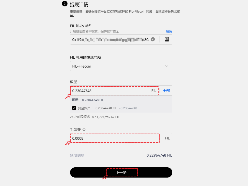 提款地址和提款网络选择完成后就可以设置提现的数量，可以查看到提现的手续费用数量，点击下一步。