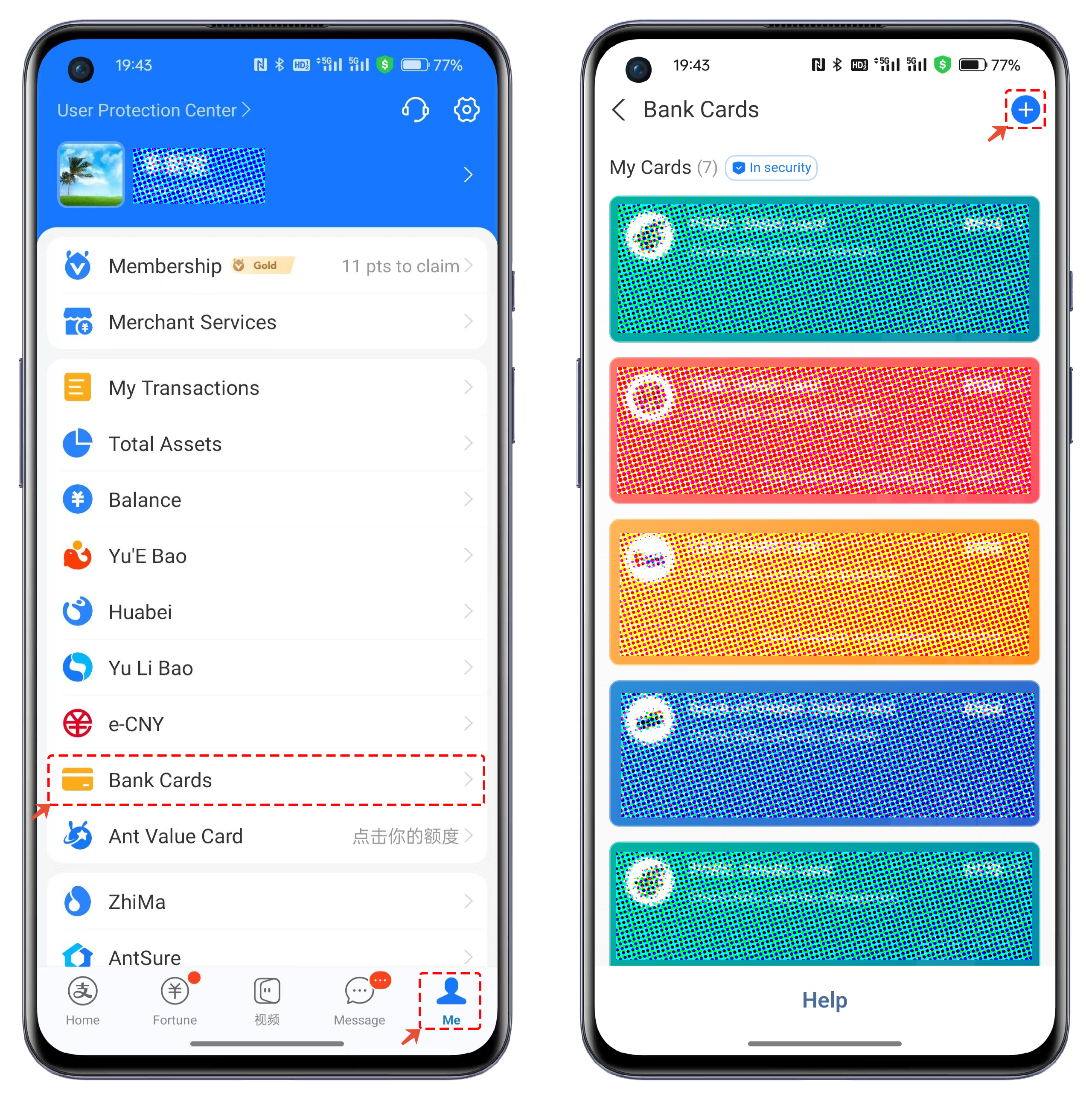 1. Open the Alipay app, click \[Me], then click \[Bank Cards]. On the Bank Cards screen, click the \[ + ] icon in the top right corner to add a bank card.