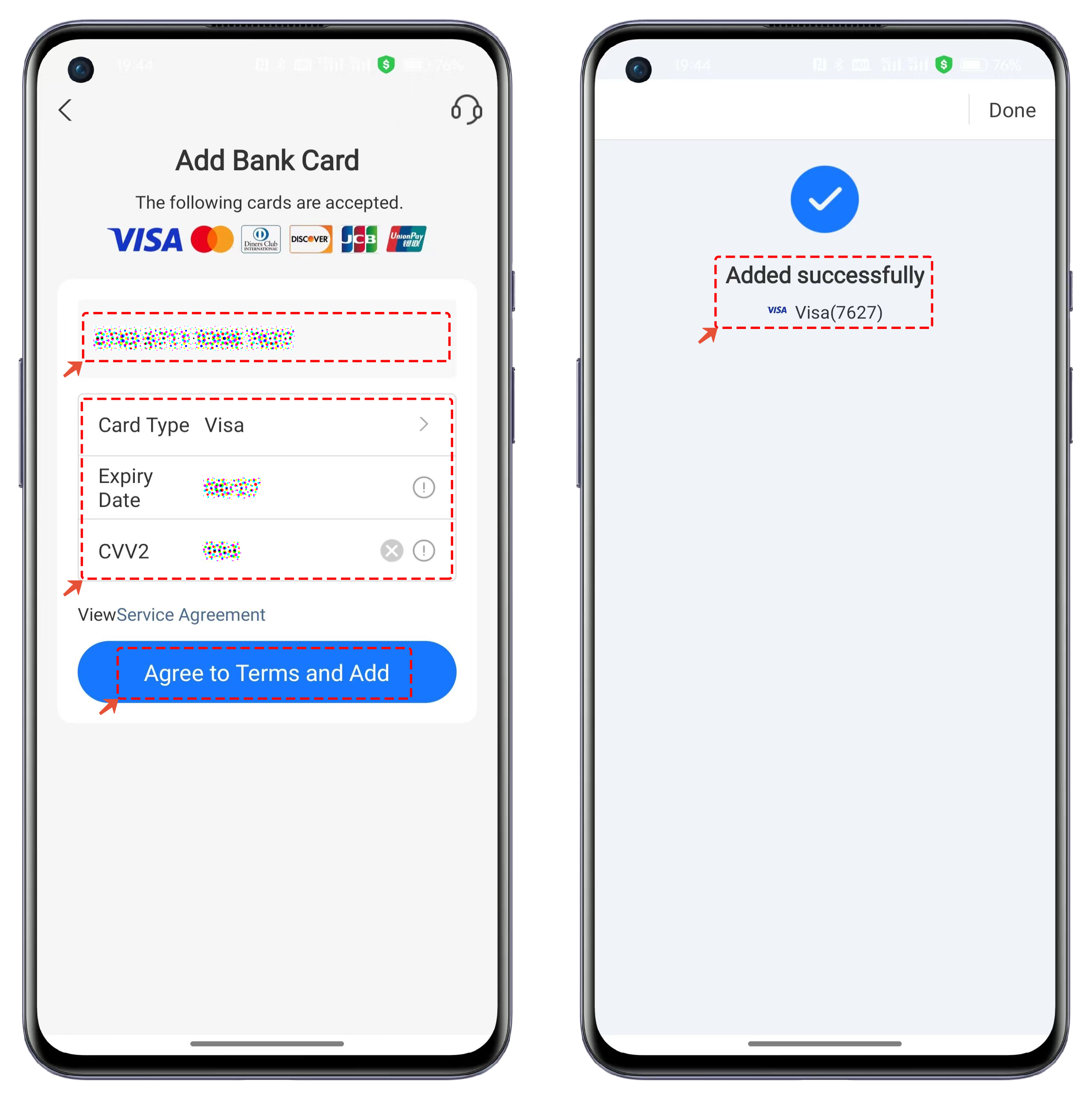 2. Enter the TP Card account number, expiration date, and CVV2 information, then click \[Agree to the Terms and Add]. Once the verification is successful, the card will be added successfully.