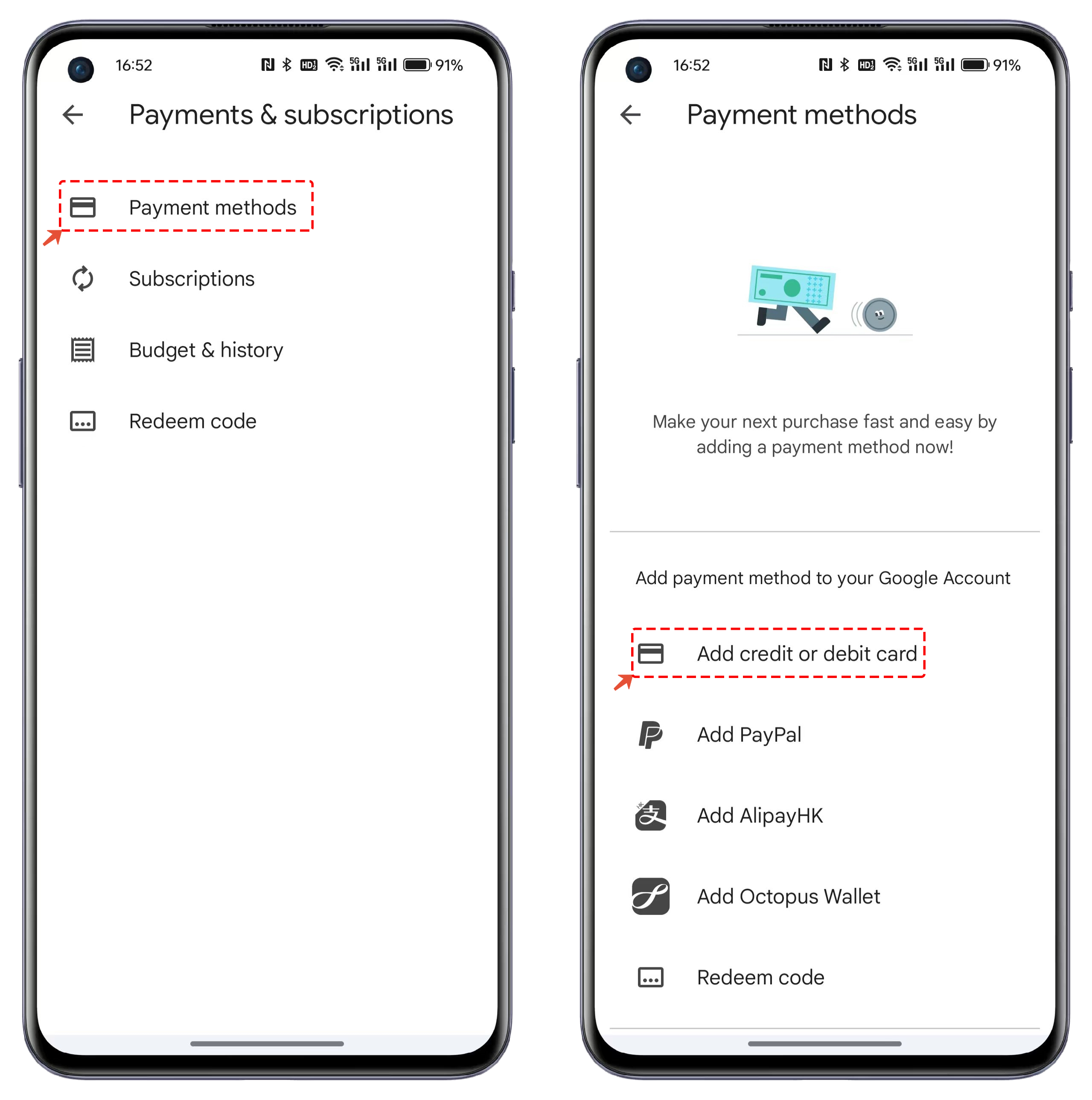 4. Since you cannot manage added cards directly in Google Play, you can click \[More Payment Settings]. The link will open, allowing you to modify or remove the added cards.
