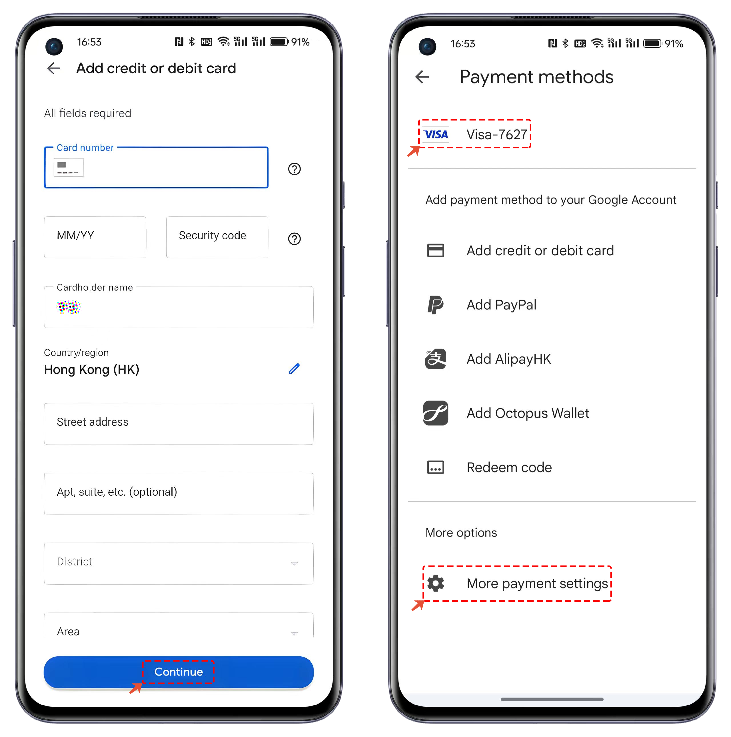 3. For the \[Add Credit or Debit Card] option, fill in all required information accurately, except for optional fields. Finally, click \[Continue] to complete the card addition. You will now be able to see the added card information under \[Payment Methods].