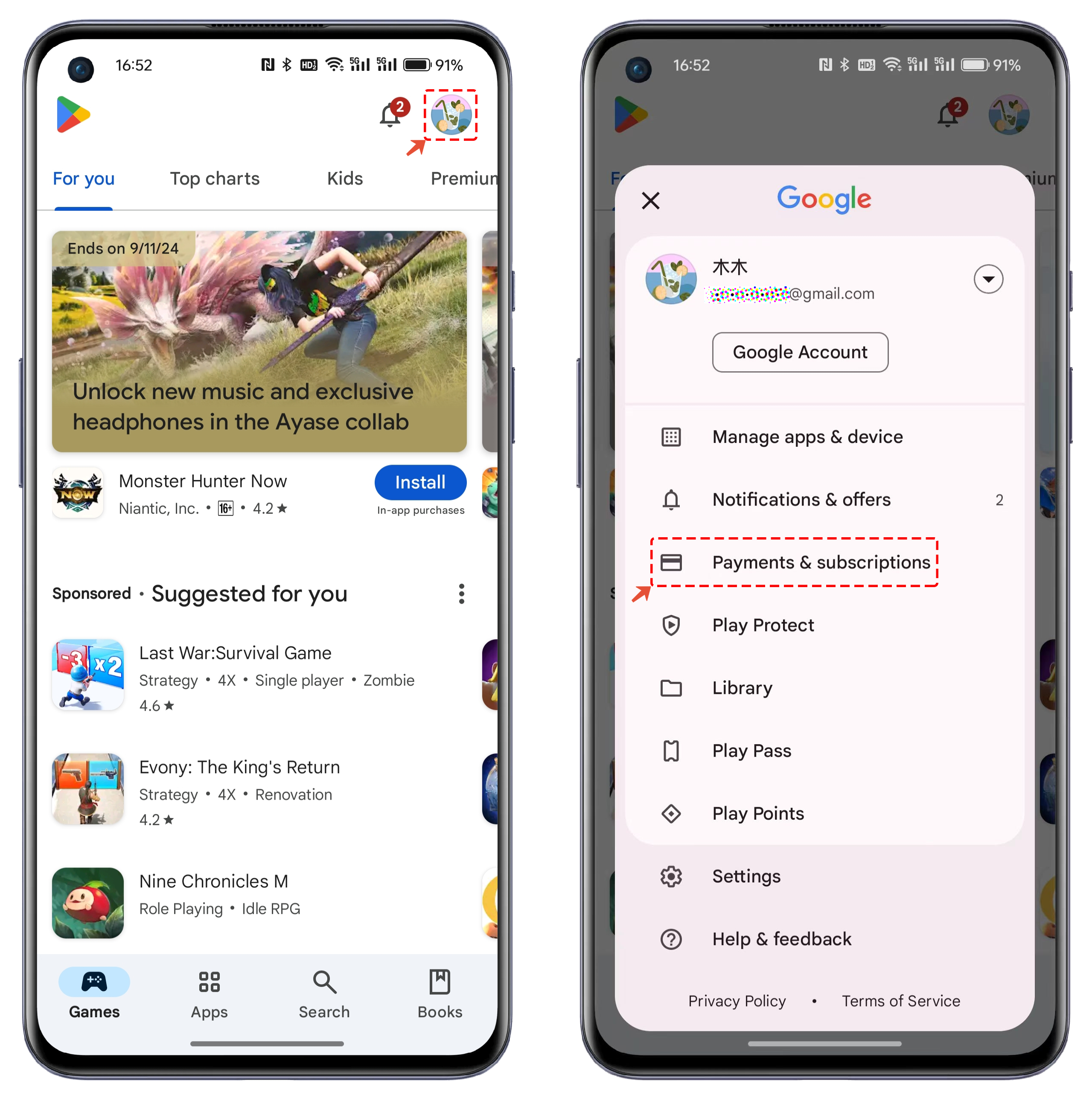 1. Open Google Play and click \[Payments & subscriptions]. You can also access it through the Android system settings or the PC web version.