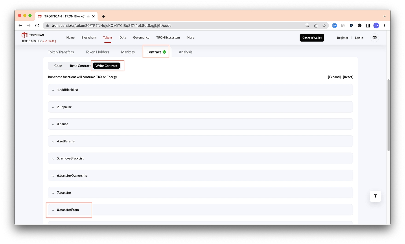 Take TRONSCAN as an example, find the USDT contract address, and click [Contract] — [Write Contract] — [8. transferfrom].