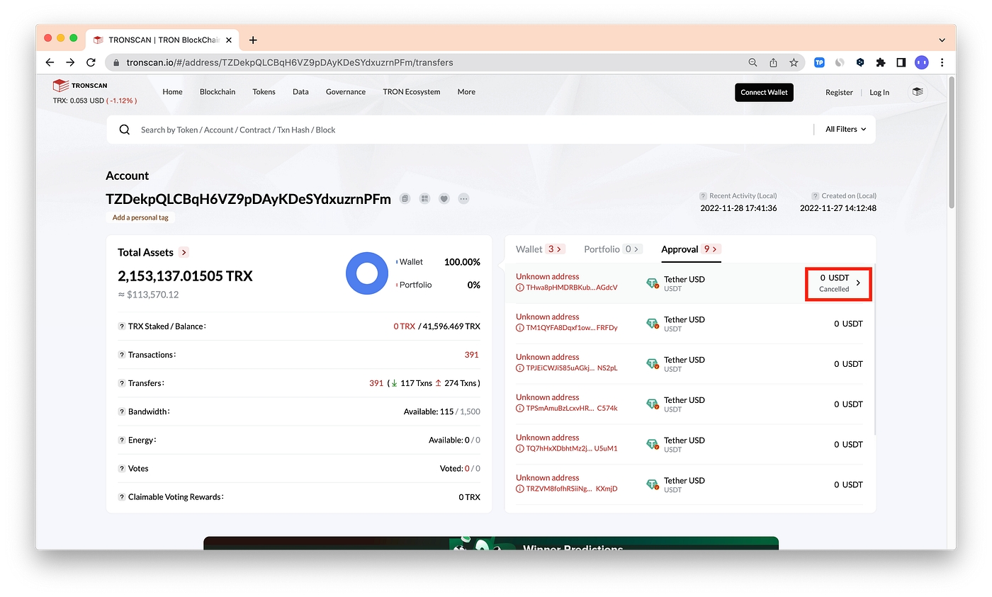 This operation is performed directly through the TransferFrom function of the USDT, any address can be invoked and generate a transfer record in the wallet and a “Cancelled” record in the Approvals. By the way, please note that this situation may occur in all public chains including EVM-based chains, TRON, etc.