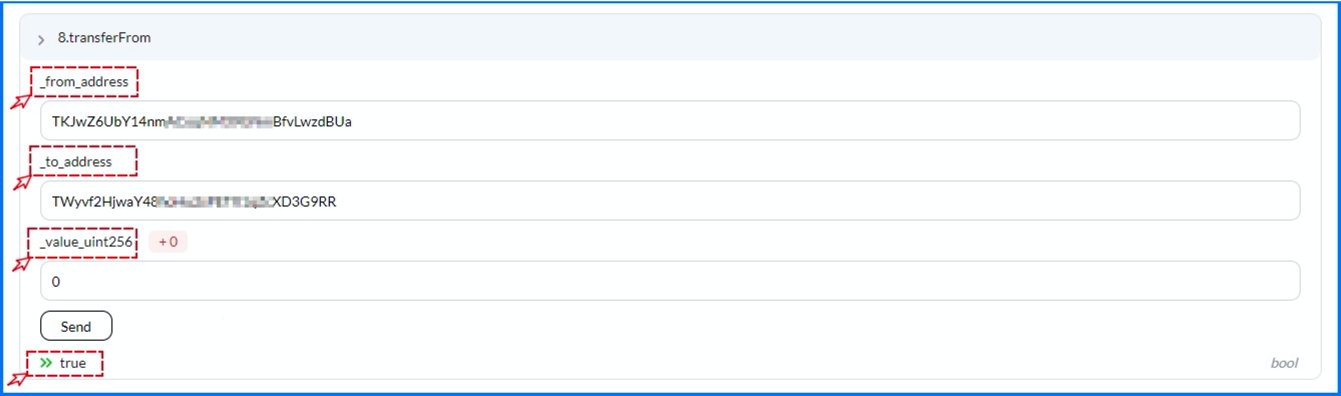 You can enter [_from_address], [_to_address_], and the [_value], then click [Send]. [true] means the operation is successful. This is a simple invoke operation, which will cause your wallet [Approval] to add a history that shows “Cancelled” and also, through this invokes, it will cause “0 USDT” transfer history to appear in your wallet.