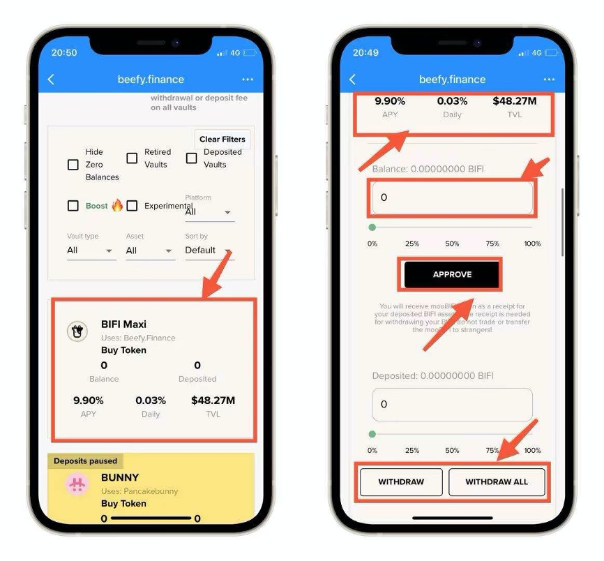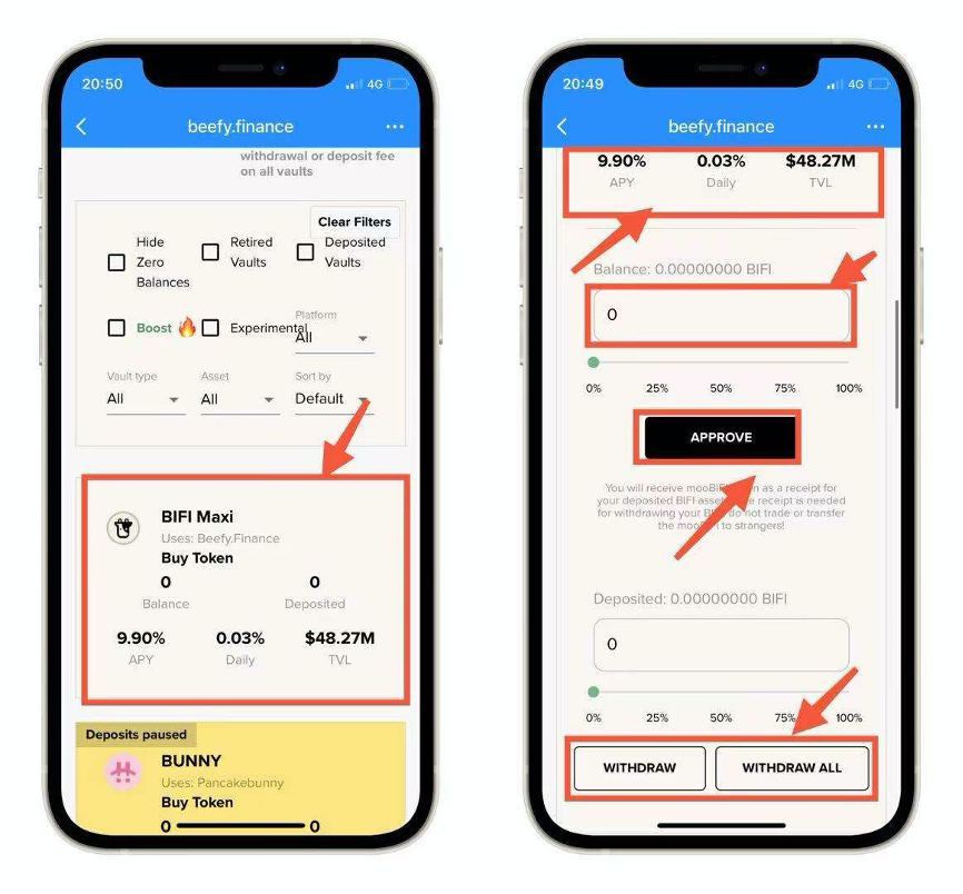 3. Once you have selected the pool you want, click to open the corresponding pool (take the BIFI Maxi pool as an example), enter the appropriate value in the upper input box and approve it to complete the pledge; enter the appropriate value in the lower input box and click on Raise to complete the withdrawal.