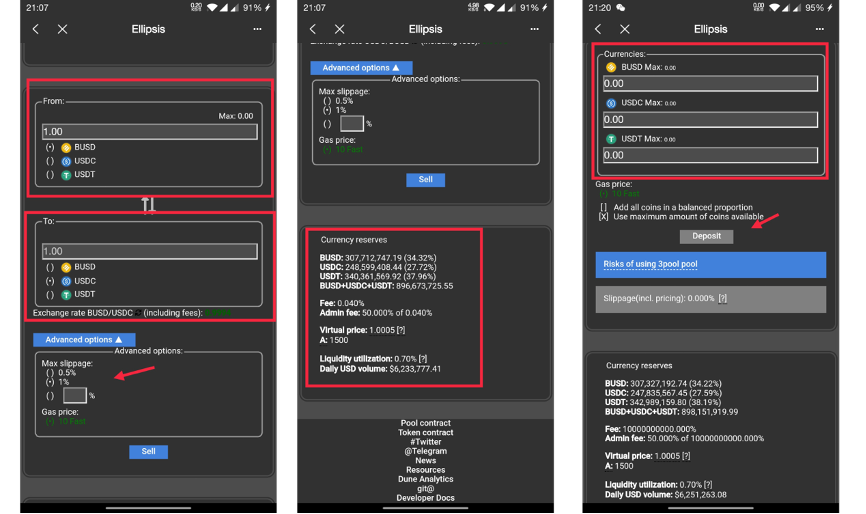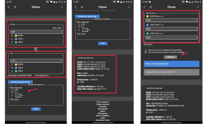 3. Go to the exchange page from the【Ellipsis pools】option, enter the quantity in the upper and lower boxes and select the corresponding tokens to be exchanged. Set the maximum transaction slippage, you can choose the default value or enter a custom value. Note that setting the maximum transaction slippage too low may cause the transaction to fail, so you need to set it according to the actual situation.