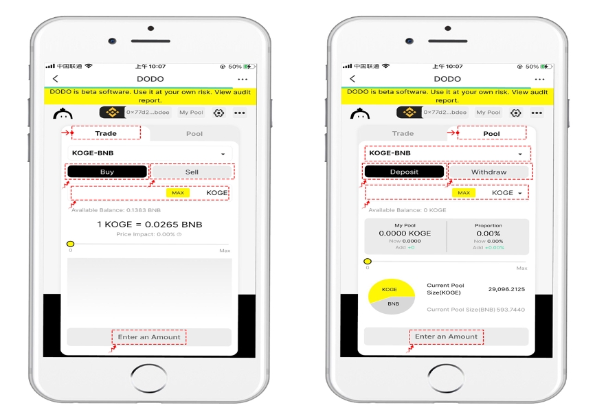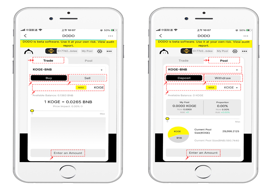 Secondly, the UI of DODO is very simple and easy to operate. There are only two functions which are【Trade】and【Pool】respectively. And【Trade】is for users to do trading. Now, it supports KOGE-BNB and BNB-BUSD pairs. Click the drop-down menu to select the corresponding currency and type the purchase and sale quantity in the input box, and the exchange can be completed after authorization.