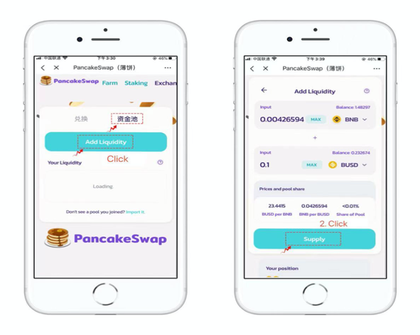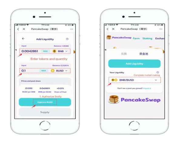 1. Pancakeswap adopts liquidity mining model, which means that LP (Liquidity Provider) can get rewards. First of all, users need to provide two different tokens for liquidity pool. Click【Pool】and use 【Add Liquidity】to select BNB and BUSD as an example to be a pair. Then, click 【Approve BUSD】to authorize.