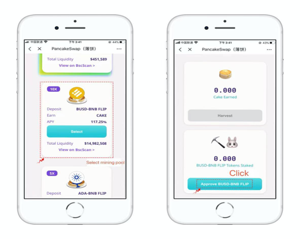 3. Users can find the Mining pool of BNB-BUSD in Farm, the 10X represents the weight of mining and the higher value means that the mining is faster. The same first time operation also need to click 【Approve BUSD-BNB FLIP 】for authorization.
