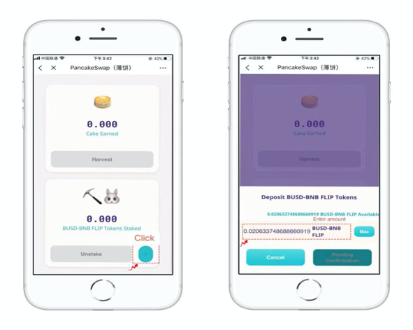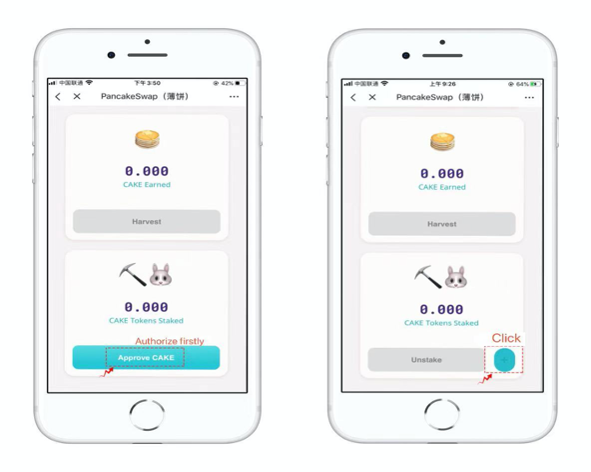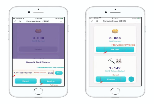 1. 1 CAKE = 1 SYRUP, staking CAKE (pancake tokens) to get SYRUP, holding SYRUP will not only get you CAKE rewards, but will also be used for subsequent functions such as pancake exchange lottery and general governance. The first operation requires authorization 【Approve CAKE】, click the blue【+】to add CAKE tokens after authorization is complete.