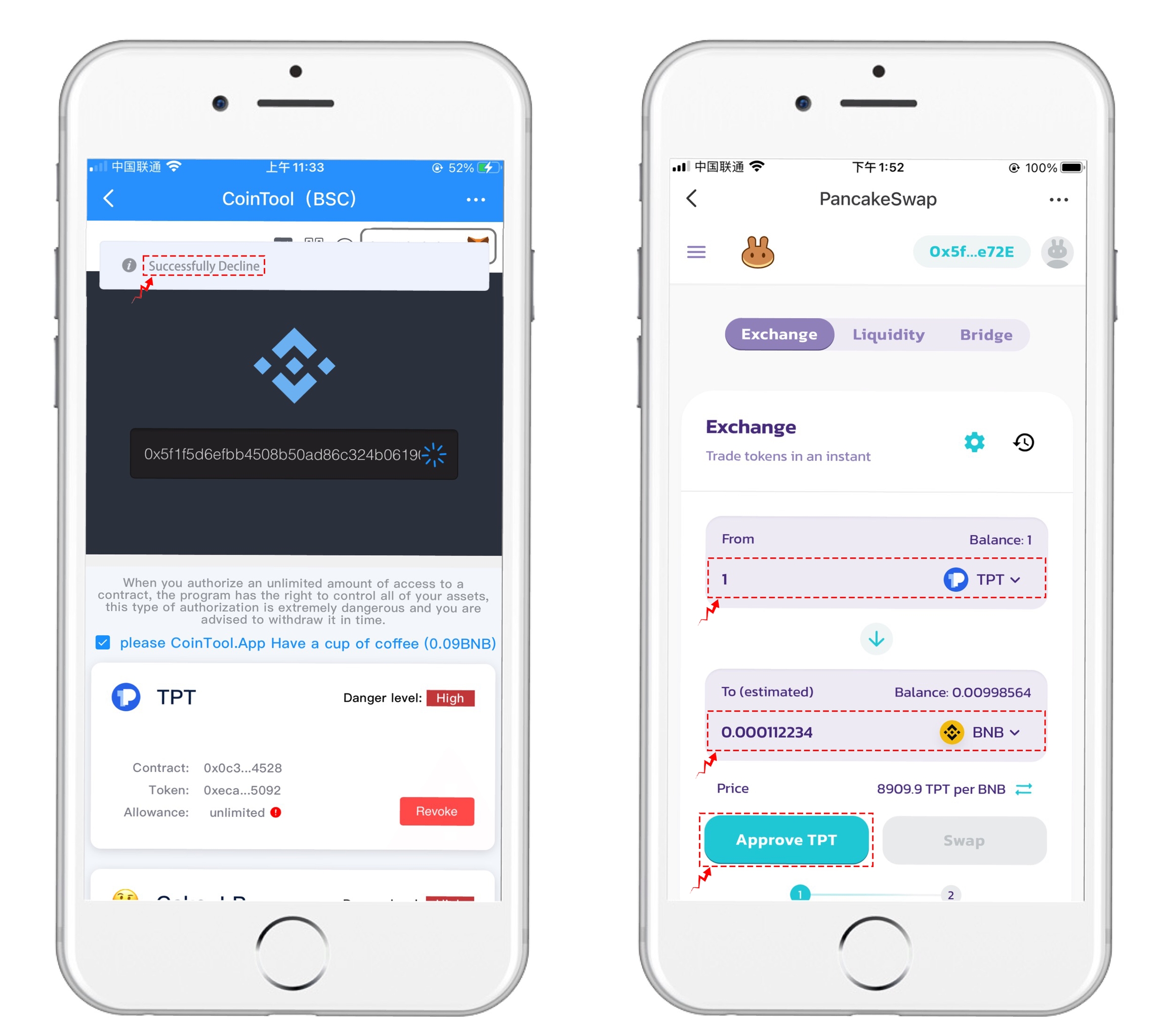 4. After the cancellation is successful, you will see the top prompt. In order to verify whether the execution is successful, we will use the TPT tokens that have just been canceled to verify. As shown in the figure below, you can see the [Approve TPT option], indicating that the cancellation of the authorization is executed successfully (only Approve will be prompted for the first operation).