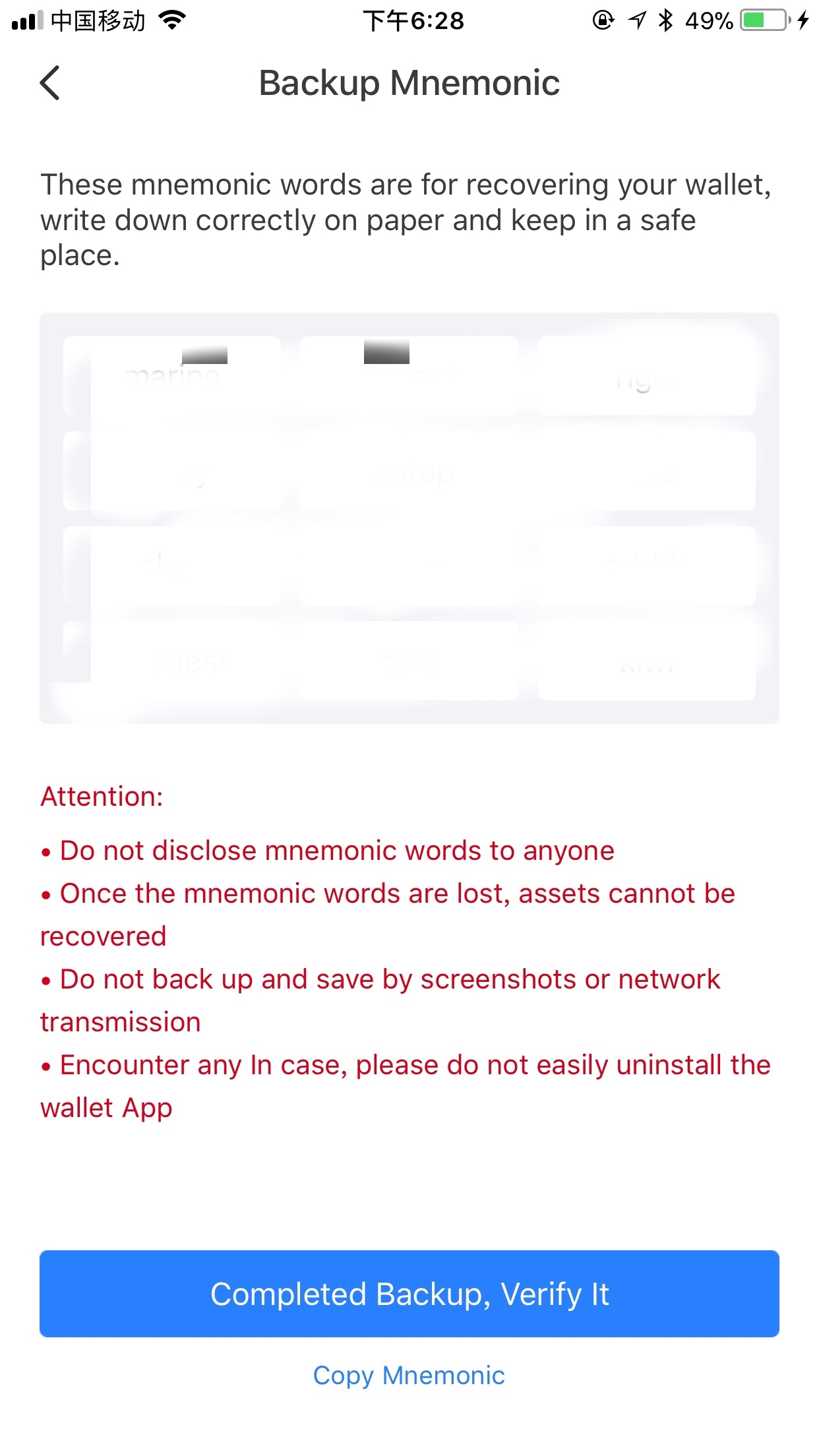 7. Write down your mnemonic words and keep in a safe place (Important)