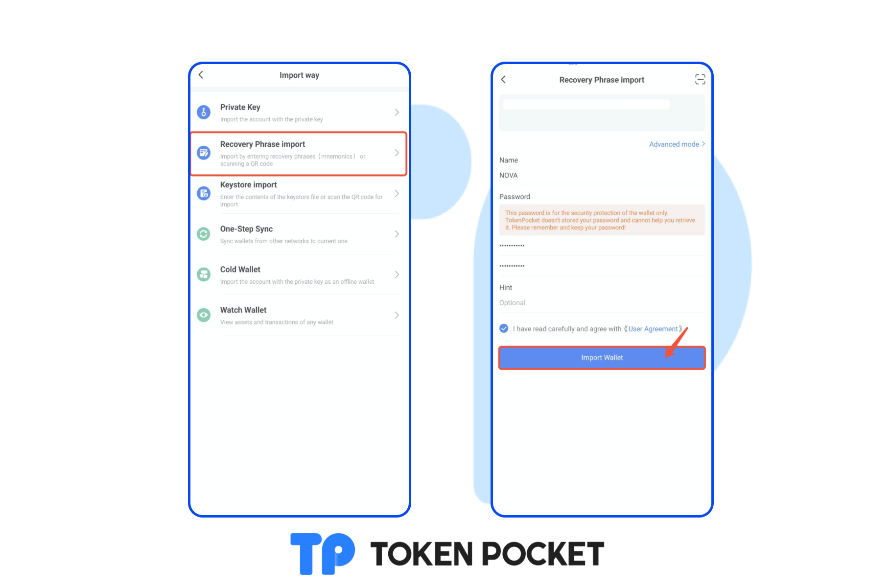 2\. Take **\[Recovery Phrase import]** as an example, enter your secret recovery phrase, wallet name, and password, click the User Agreement, and click **\[Import Wallet]**.