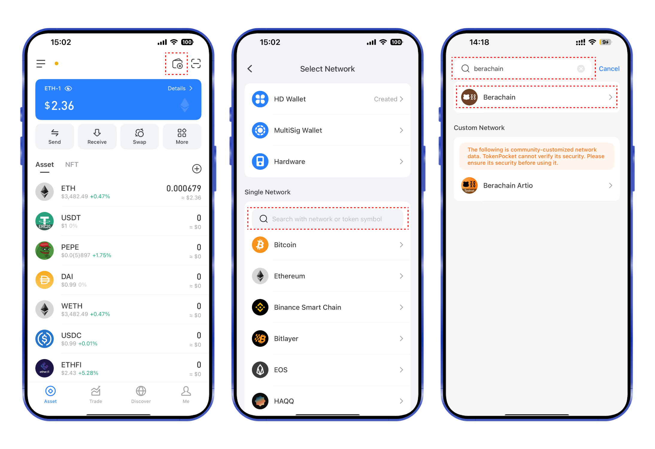 1. Open the TokenPocket APP, click ![](https://help.tokenpocket.pro/~gitbook/image?url=https%3A%2F%2F659607907-files.gitbook.io%2F%7E%2Ffiles%2Fv0%2Fb%2Fgitbook-x-prod.appspot.com%2Fo%2Fspaces%252F-MMJyYRLFVRsMrfcXuRV%252Fuploads%252FUjYAAs2G6BZ8CNsYXCiH%252Fimage.png%3Falt%3Dmedia%26token%3D9adac656-510e-4346-8334-d99ad71f1417\&width=300\&dpr=4\&quality=100\&sign=51b8ebd8\&sv=1) on the upper right corner, click the search bar, and enter **Berachain;**