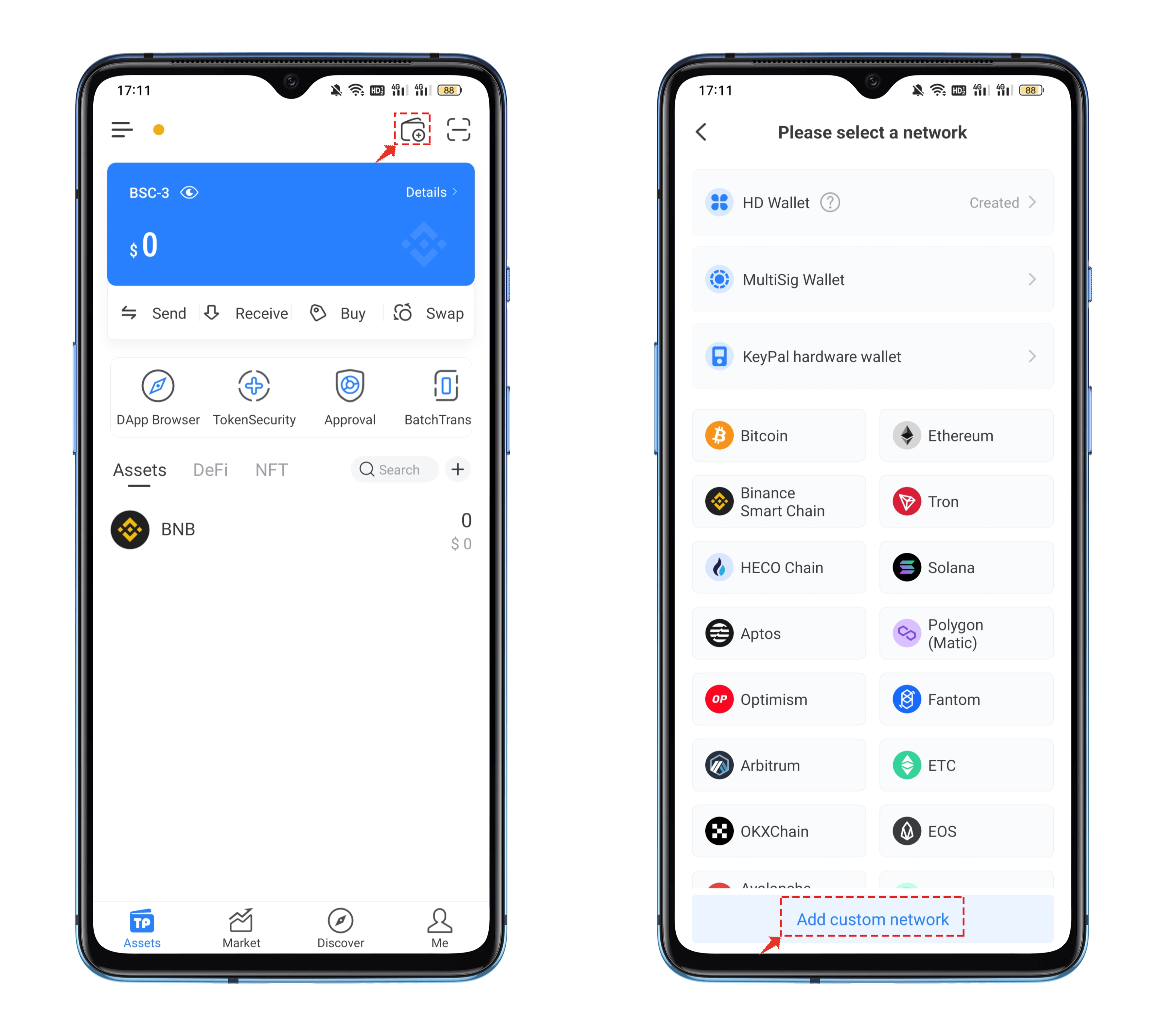 1、Open TokenPocket, click Add Wallet in the top right corner, and click【Add Custom Network】.