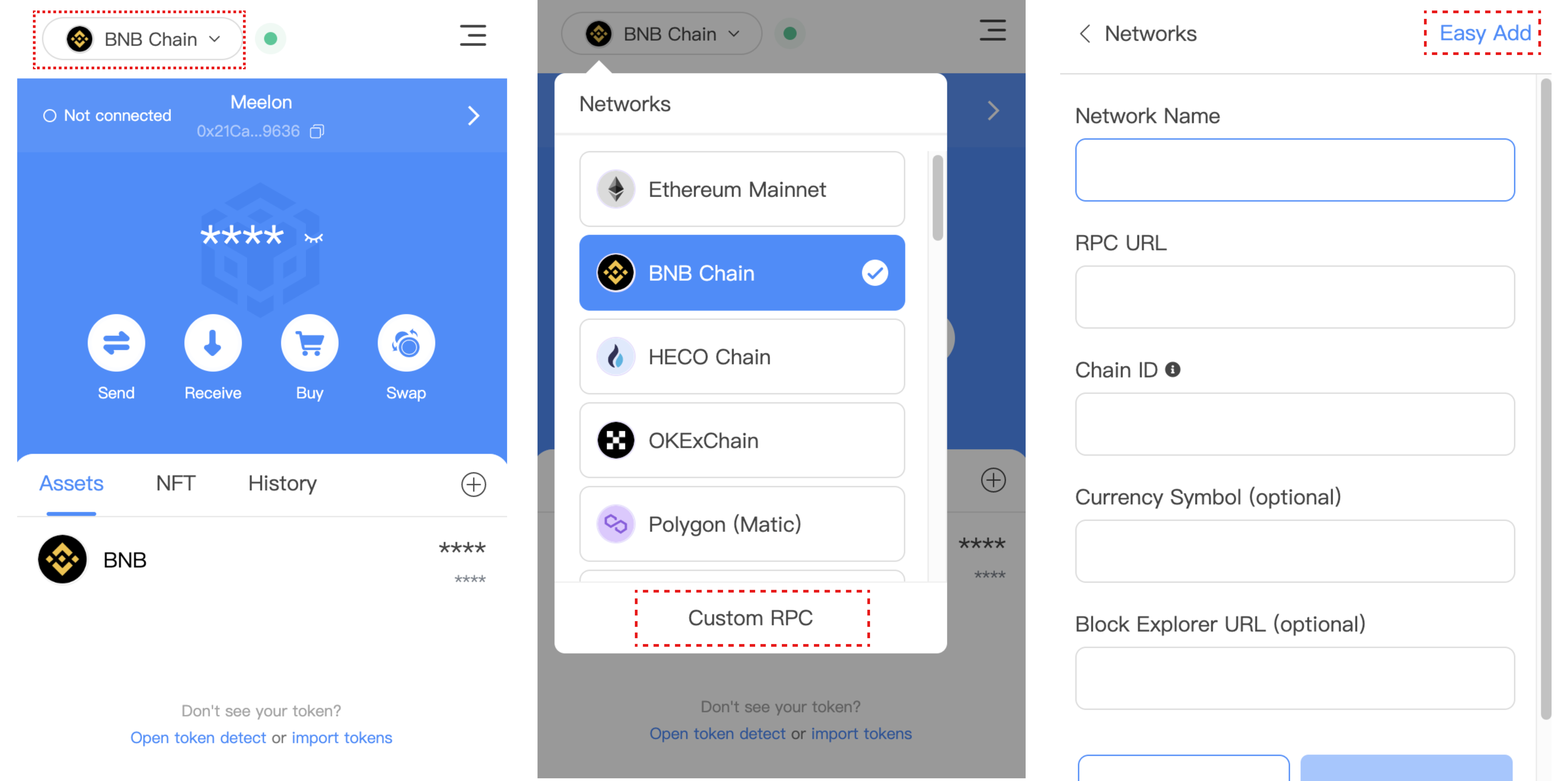 1. Click the upper left corner to switch networks, click  【Custom RPC】, and click 【Easy Add】.