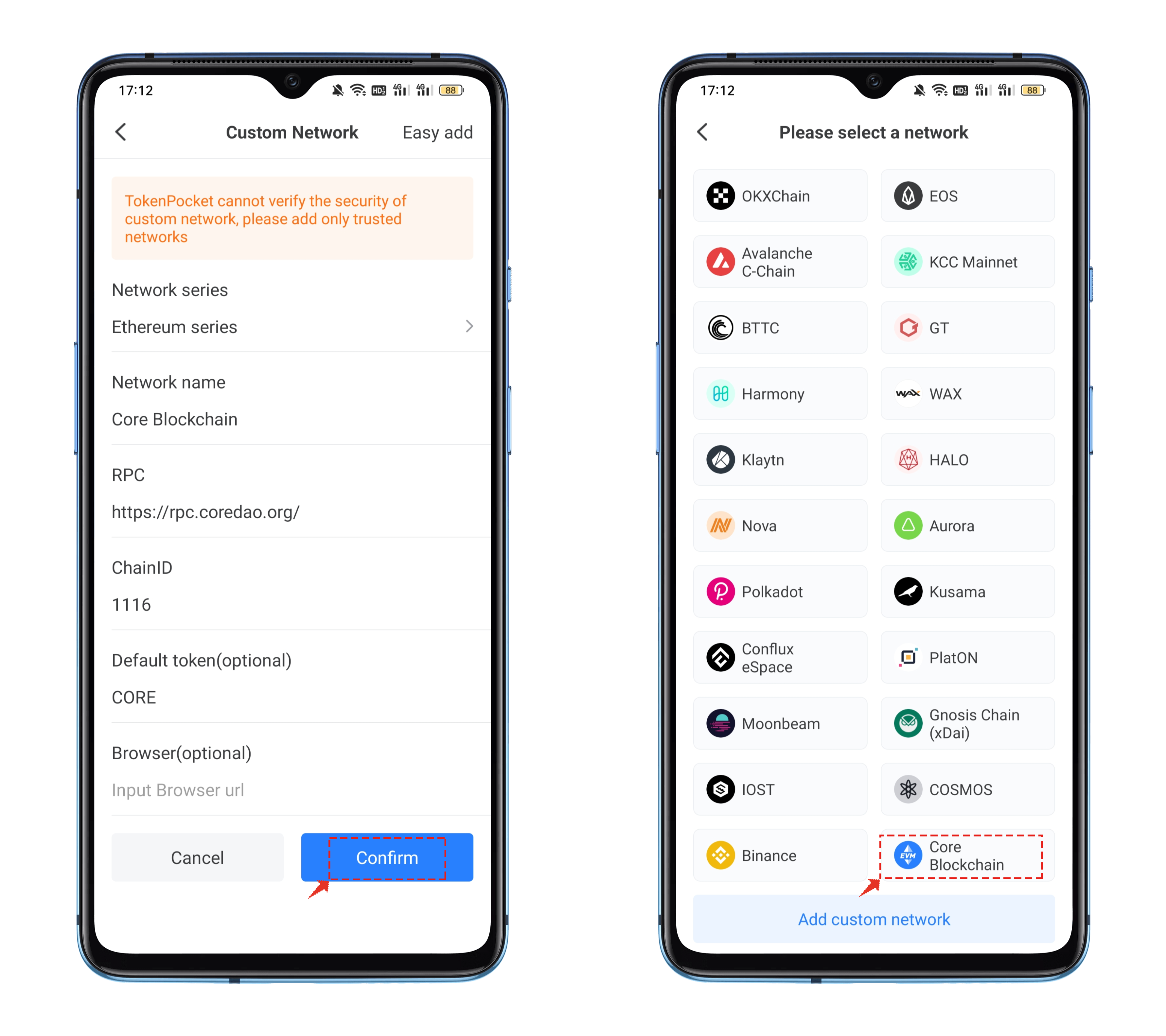 3\. Double-check the information and click “Confirm”. Go back to the “Select Network” interface and pull down to the bottom to see the Core Blockchain.
