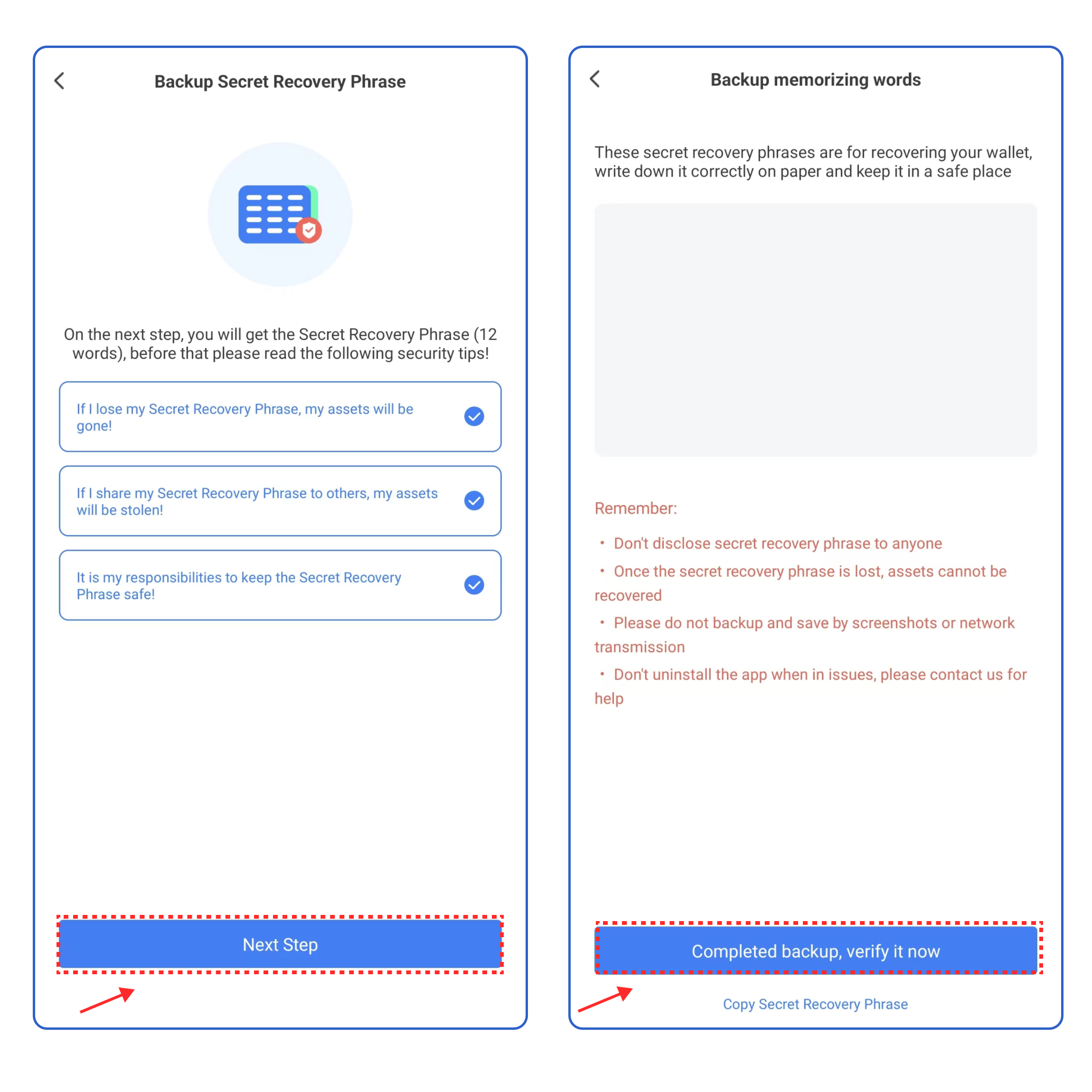 4\.  Select the security tips, and click **\[Next Step]**. Back up the secret recovery phrase on the paper or on the [**KeyPal**](https://www.keypal.pro/en/), and store it in a safe place. Click **\[Completed backup, verify now]** .