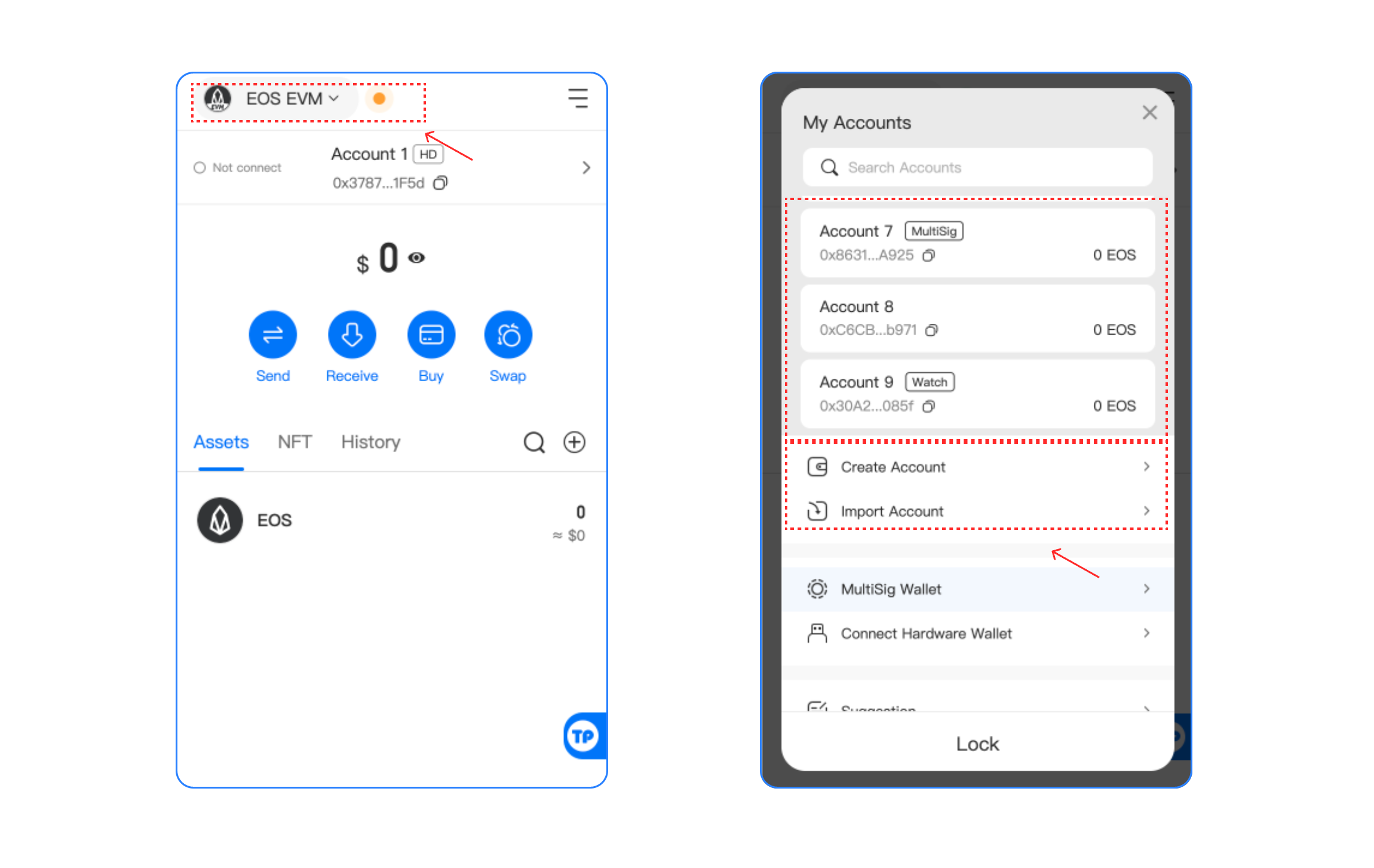 2. After you select, you can view your **EOS EVM** **Wallet** on the Assets page, click the upper right corner to access the management page, you can switch your wallet, and create/import a wallet on this page.