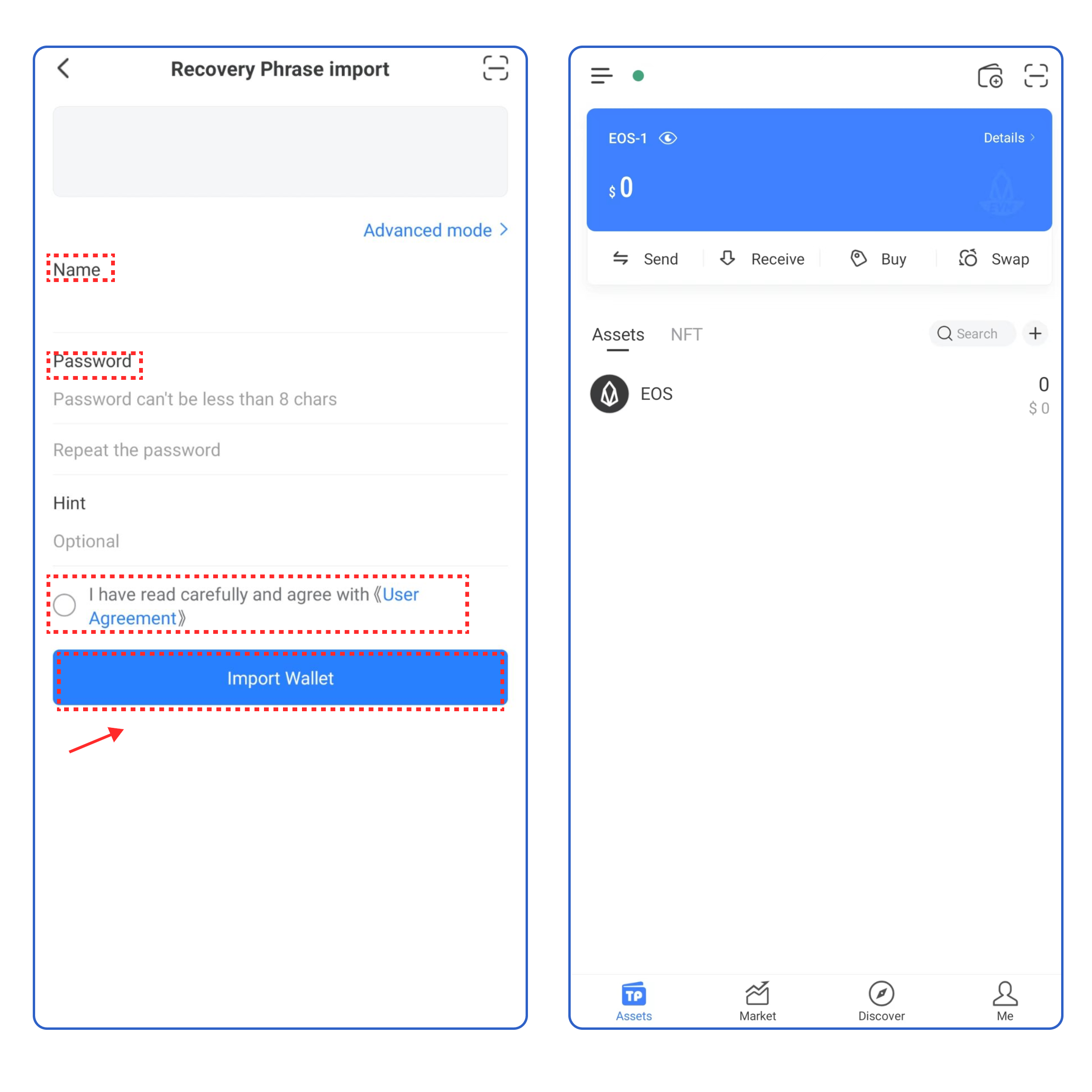 3\. Take **\[Recovery Phrase import]** as an example, enter your secret recovery phrase, wallet name, and password, click the User Agreement, and click **\[Import Wallet]**. At this point, you have successfully imported an EOS EVM wallet.​​