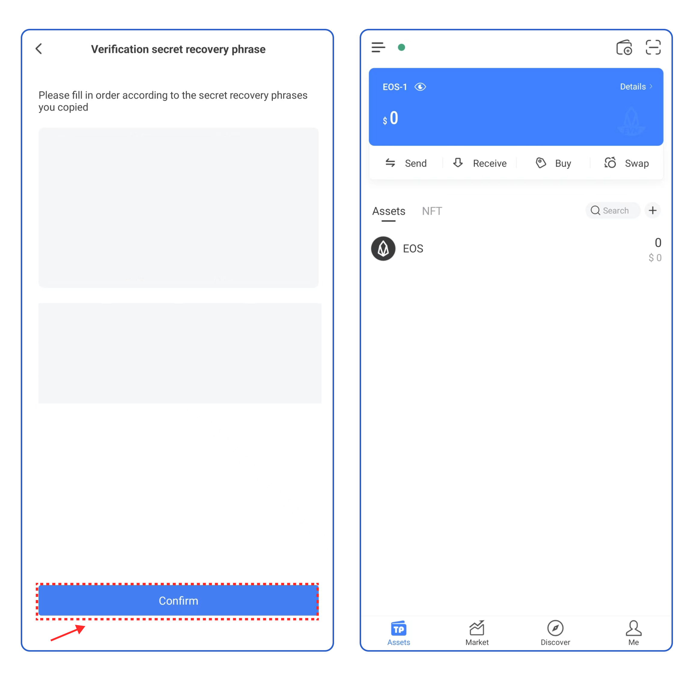 5\. Enter your secret recovery phrase, and click **\[Confirm].** At this point, you have successfully created an EOS EVM wallet.
