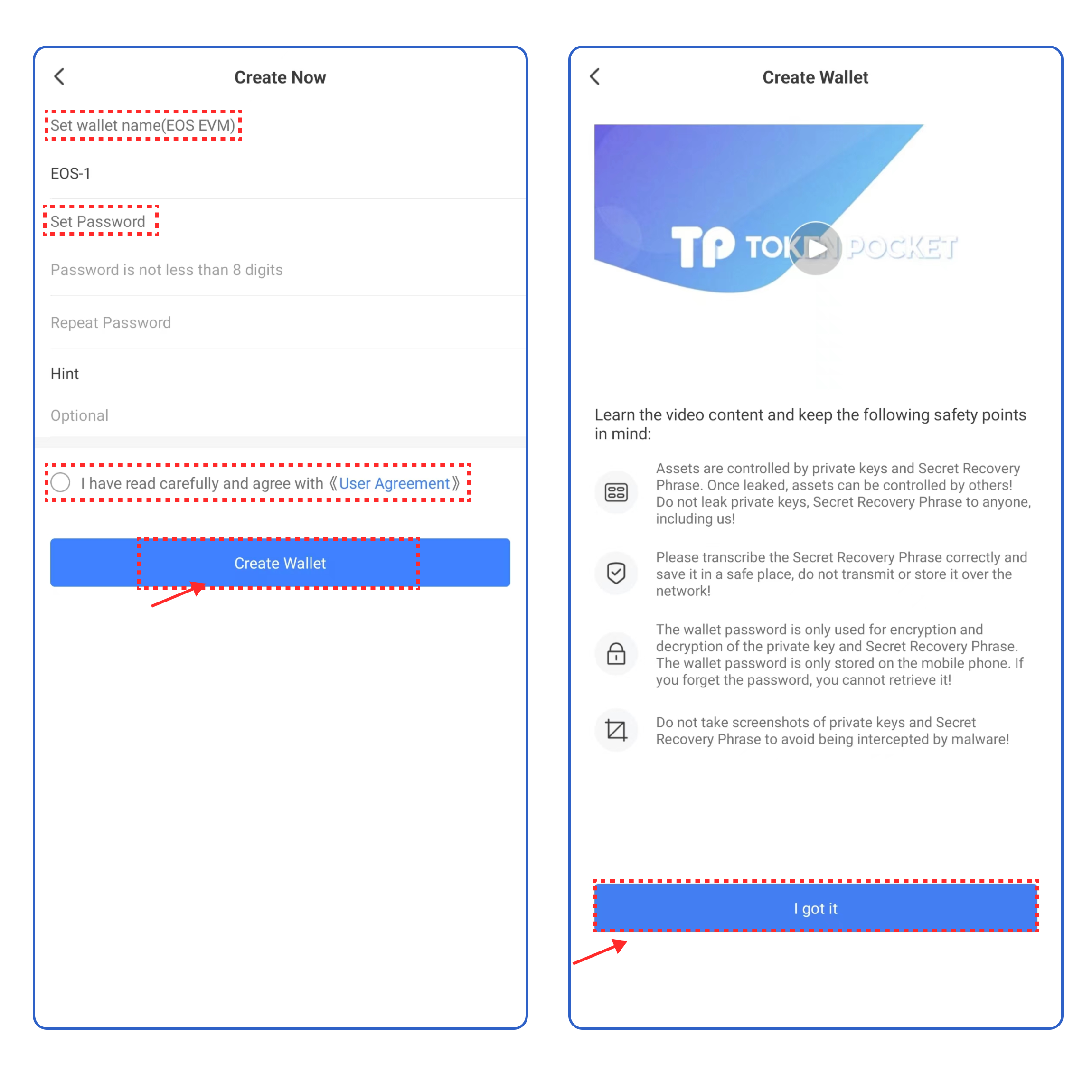 3\. Set the wallet name and password, click the User Agreement, and click **\[Create Wallet].** Watch and learn the video content, click **\[I got it].**