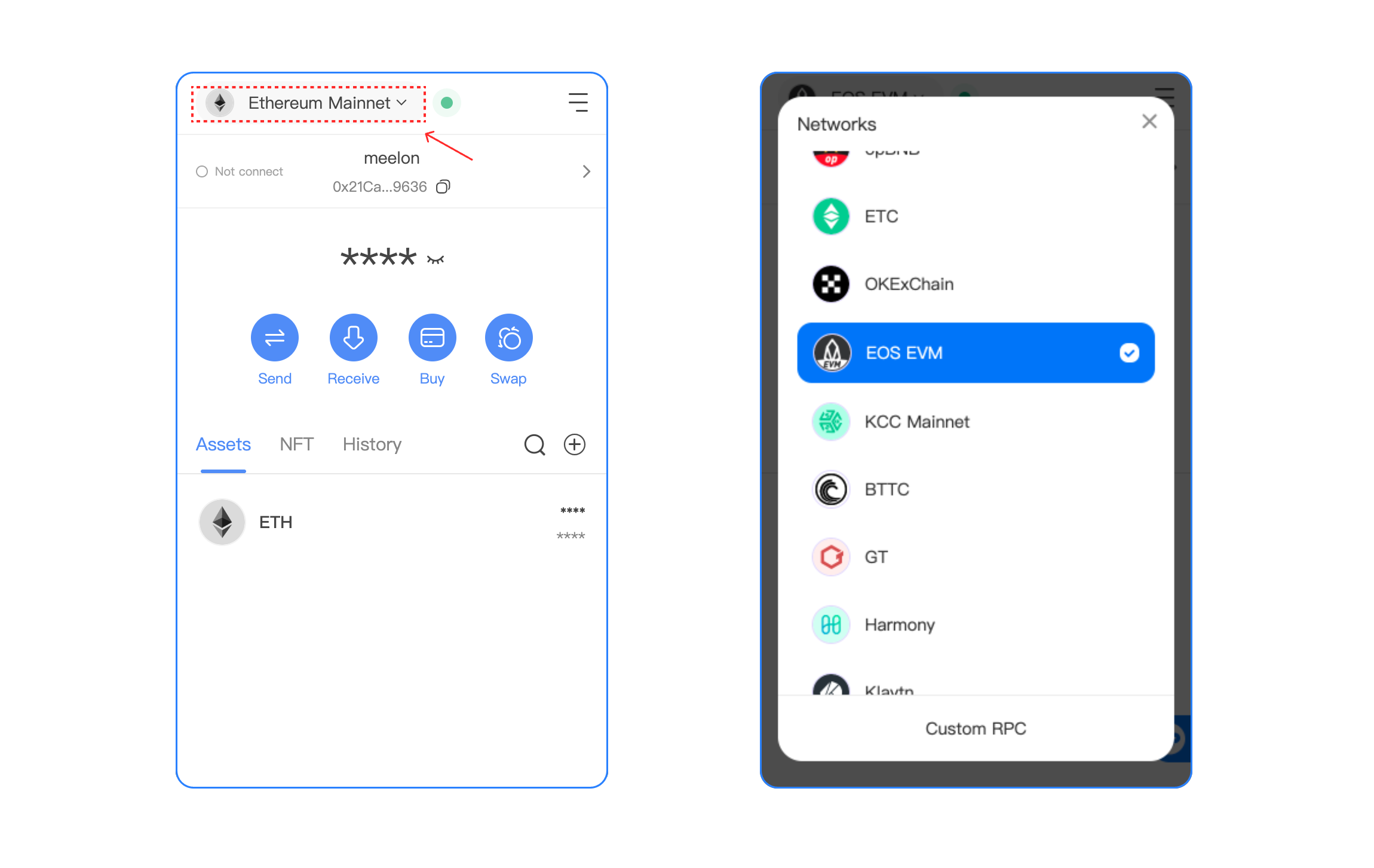 1. Open TokenPocket Chrome Extension, and click the upper left corner to select the **EOS EVM Network**.