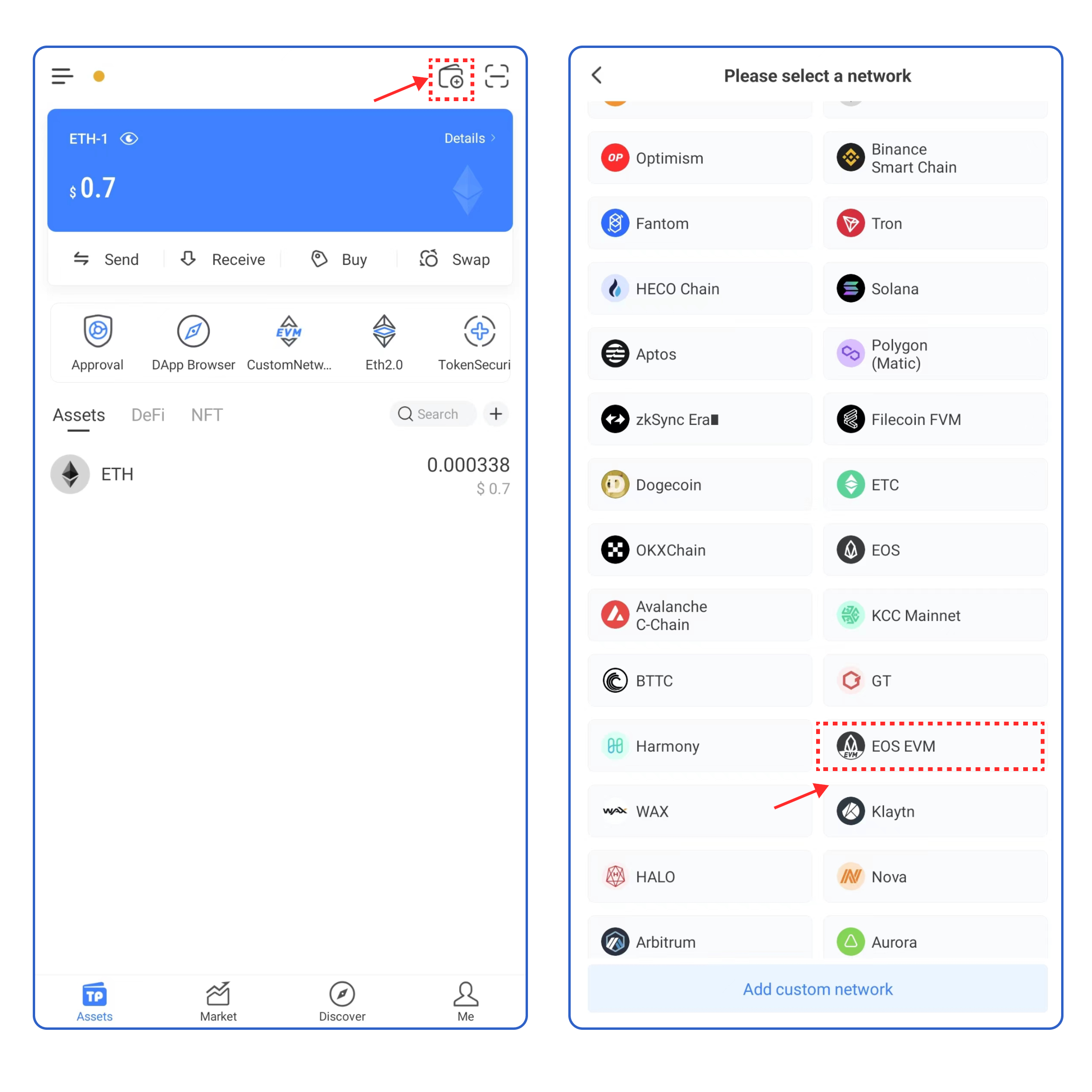 1. Open the TokenPocket APP, click ![](https://2634619309-files.gitbook.io/~/files/v0/b/gitbook-x-prod.appspot.com/o/spaces%2F3qtItoZih7cEdFc6kPNk%2Fuploads%2F6ZoU2Zcf5fEAURO5DaI9%2Fimage.png?alt=media\&token=a9e4d155-f5fd-4aac-bdf2-5674b2ae2aa0) on the upper right corner, and select EOS EVM;