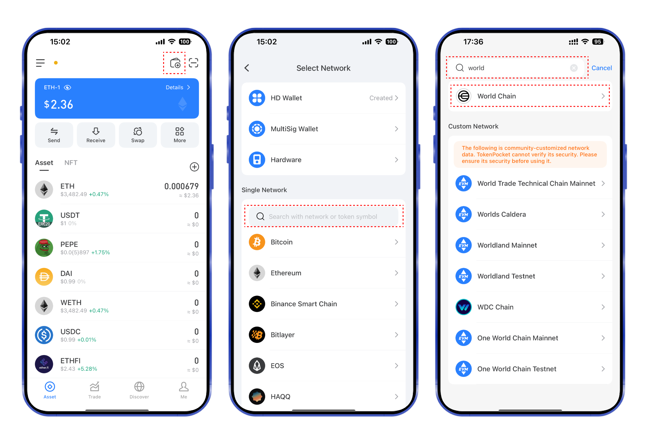 1. Open the TokenPocket APP, click ![](https://help.tokenpocket.pro/~gitbook/image?url=https%3A%2F%2F659607907-files.gitbook.io%2F%7E%2Ffiles%2Fv0%2Fb%2Fgitbook-x-prod.appspot.com%2Fo%2Fspaces%252F-MMJyYRLFVRsMrfcXuRV%252Fuploads%252FUjYAAs2G6BZ8CNsYXCiH%252Fimage.png%3Falt%3Dmedia%26token%3D9adac656-510e-4346-8334-d99ad71f1417\&width=300\&dpr=4\&quality=100\&sign=51b8ebd8\&sv=1) on the upper right corner, click the search bar, and enter **World Chain**;