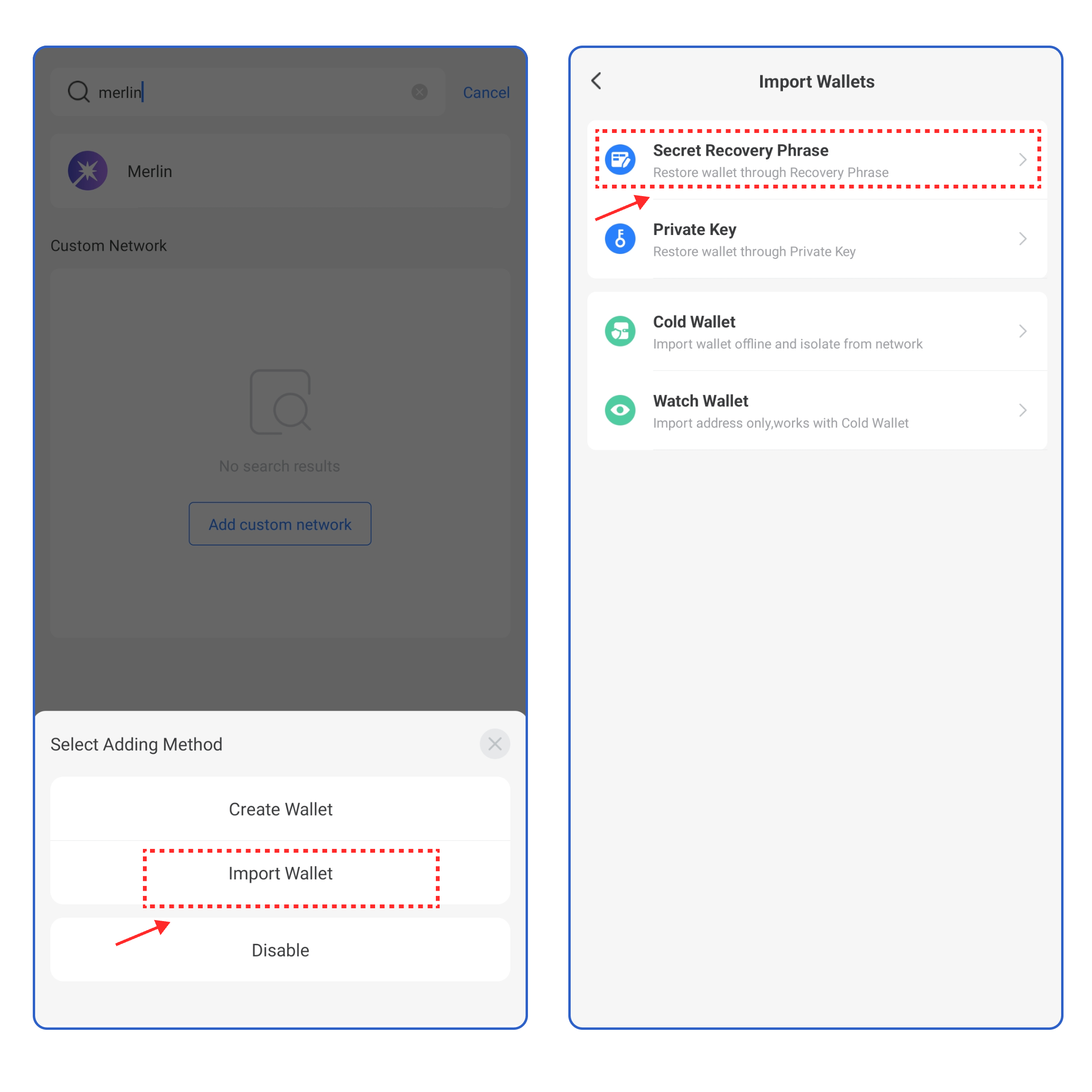 2\. Click **\[Import Wallet]**, and select the way you want to import your wallet.