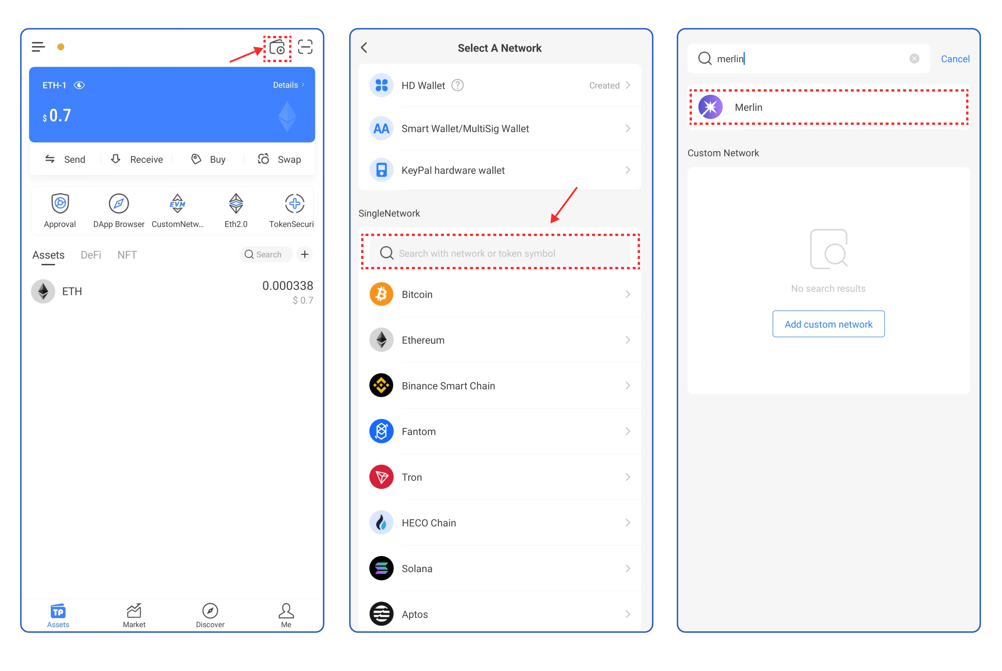 1. Open TokenPocket APP, click ![](https://659607907-files.gitbook.io/~/files/v0/b/gitbook-x-prod.appspot.com/o/spaces%2F-MMJyYRLFVRsMrfcXuRV%2Fuploads%2FUjYAAs2G6BZ8CNsYXCiH%2Fimage.png?alt=media\&token=9adac656-510e-4346-8334-d99ad71f1417) on the upper right corner, click the search bar, and enter **Merlin**;