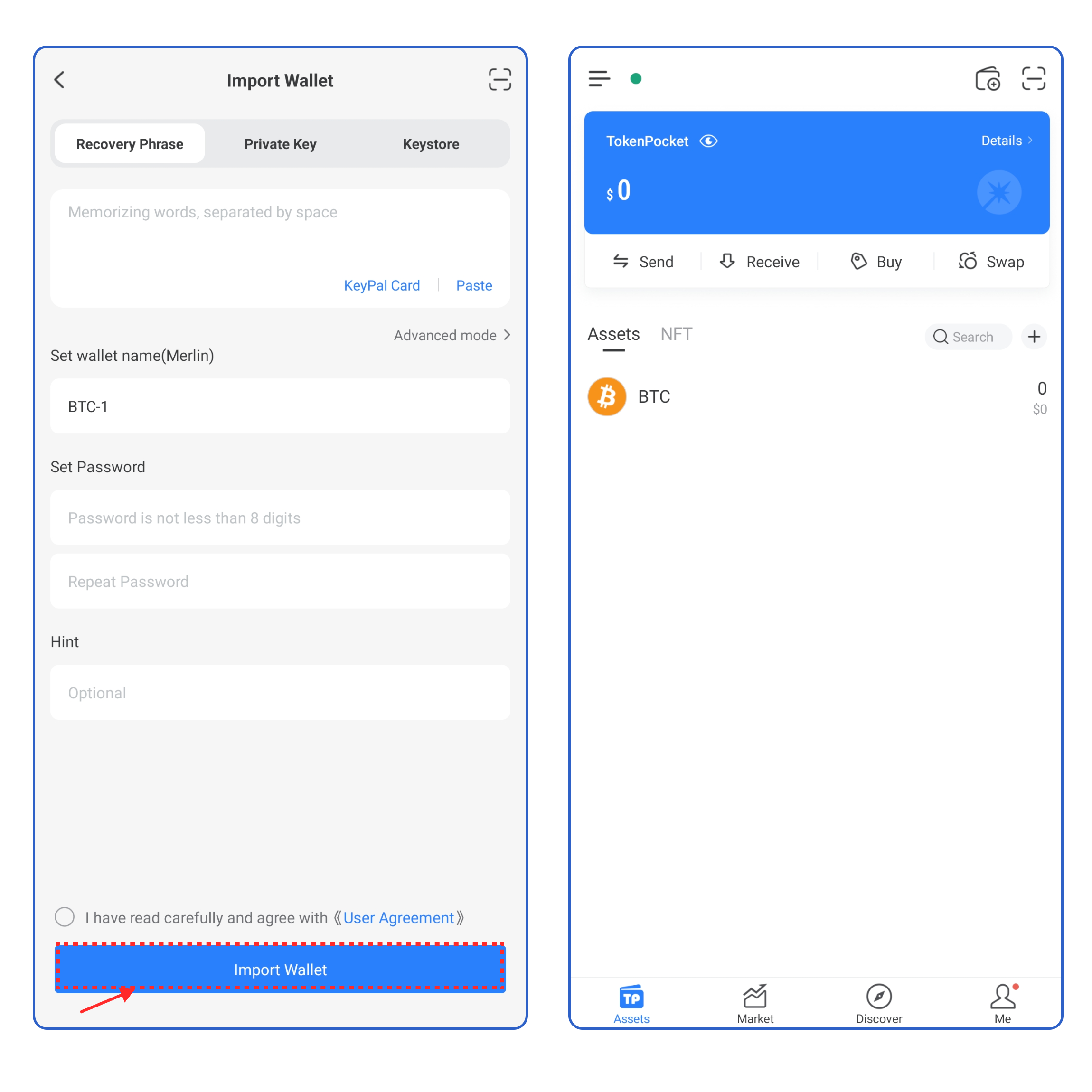 3\. Take **\[Recovery Phrase import]** as an example, enter your secret recovery phrase, wallet name, and password, click the User Agreement, and click **\[Import Wallet]**. At this point, you have successfully imported a **Merlin** wallet.​​