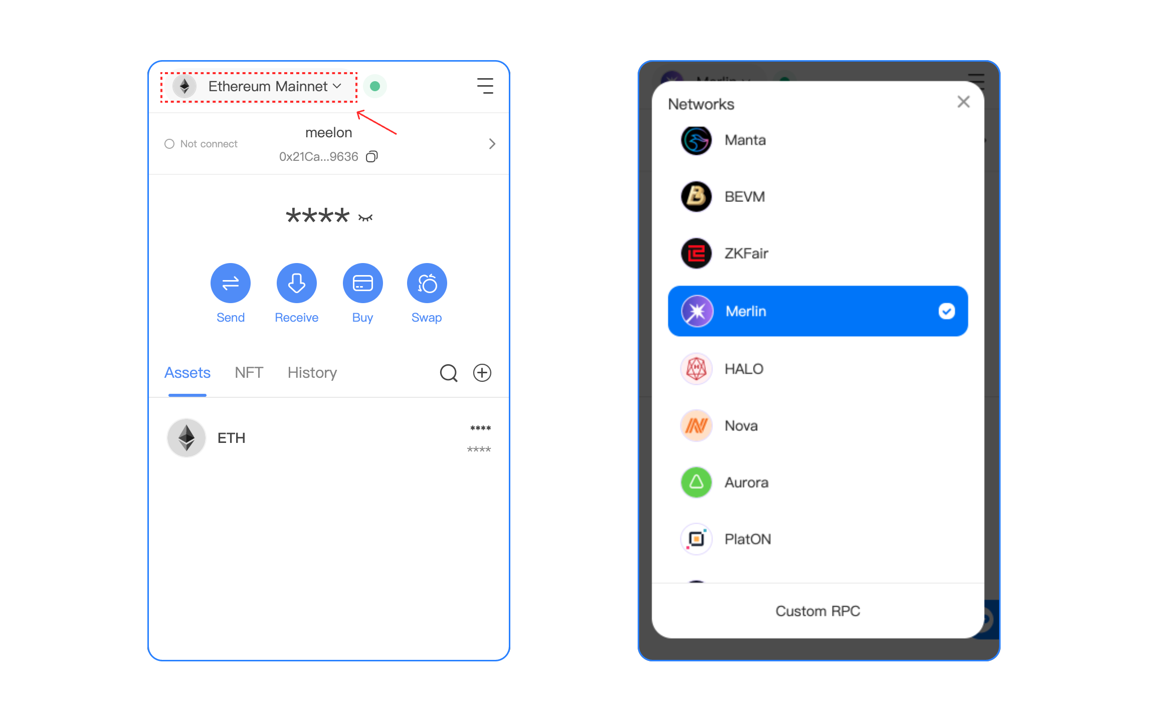 1. Open TokenPocket Chrome Extension, and click the upper left corner to select the **Merlin Network**.