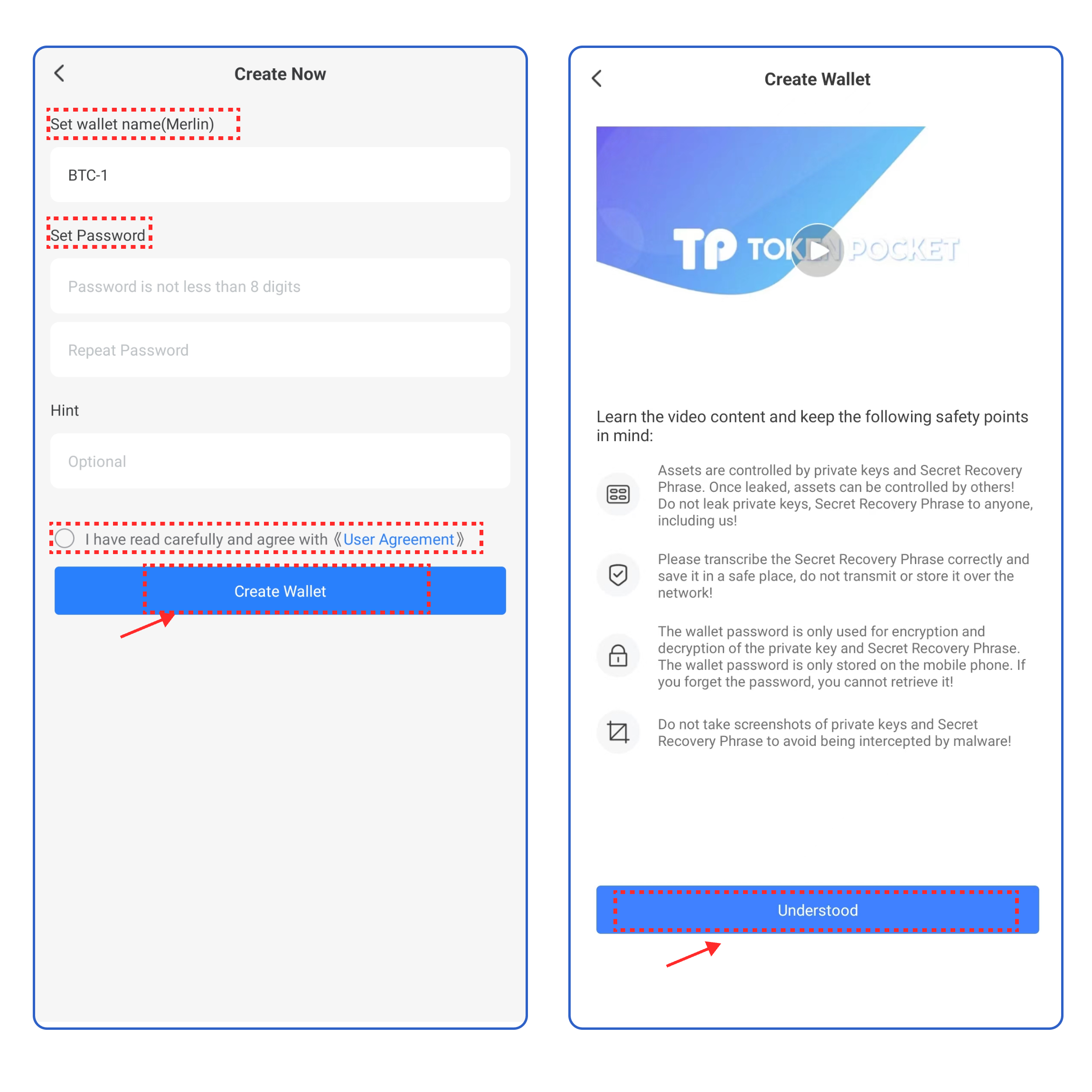 3\. Set the wallet name and password, click the User Agreement, and click **\[Create Wallet].** Watch and learn the video content, click **\[Understood].**
