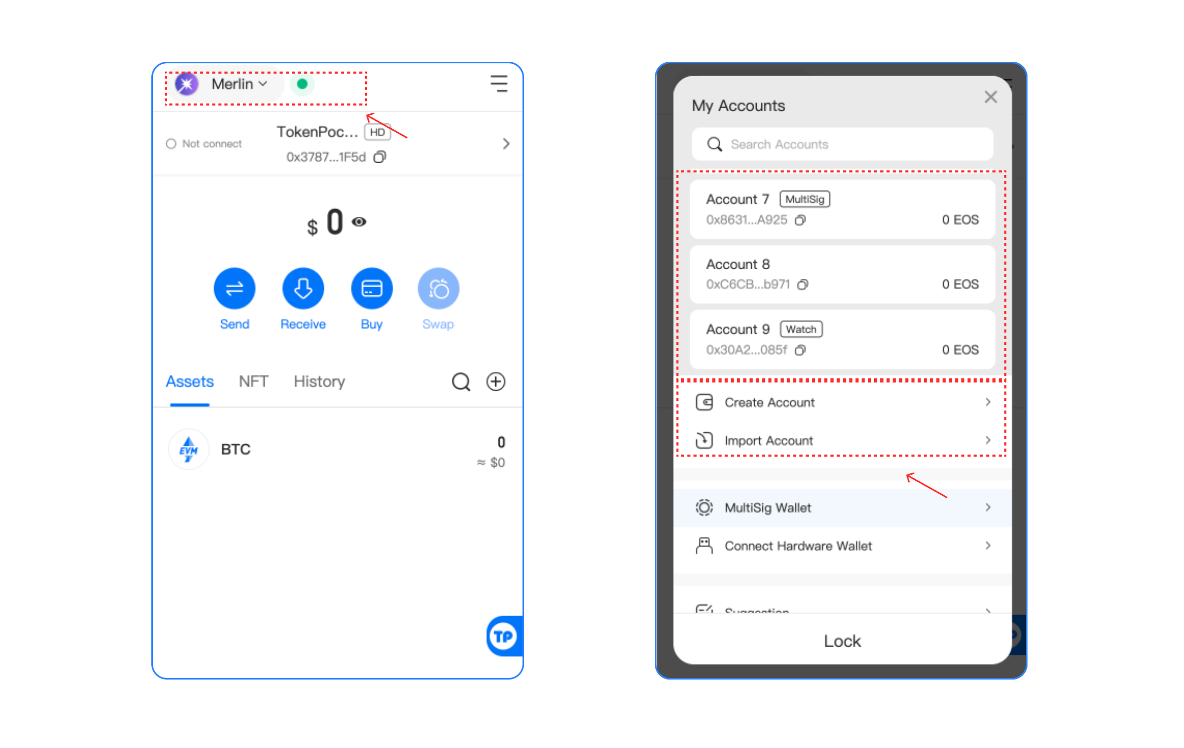 2. After you select, you can view your **Merlin** **Wallet** on the Assets page, click the upper right corner to access the management page, you can switch your wallet, and create/import a wallet on this page.